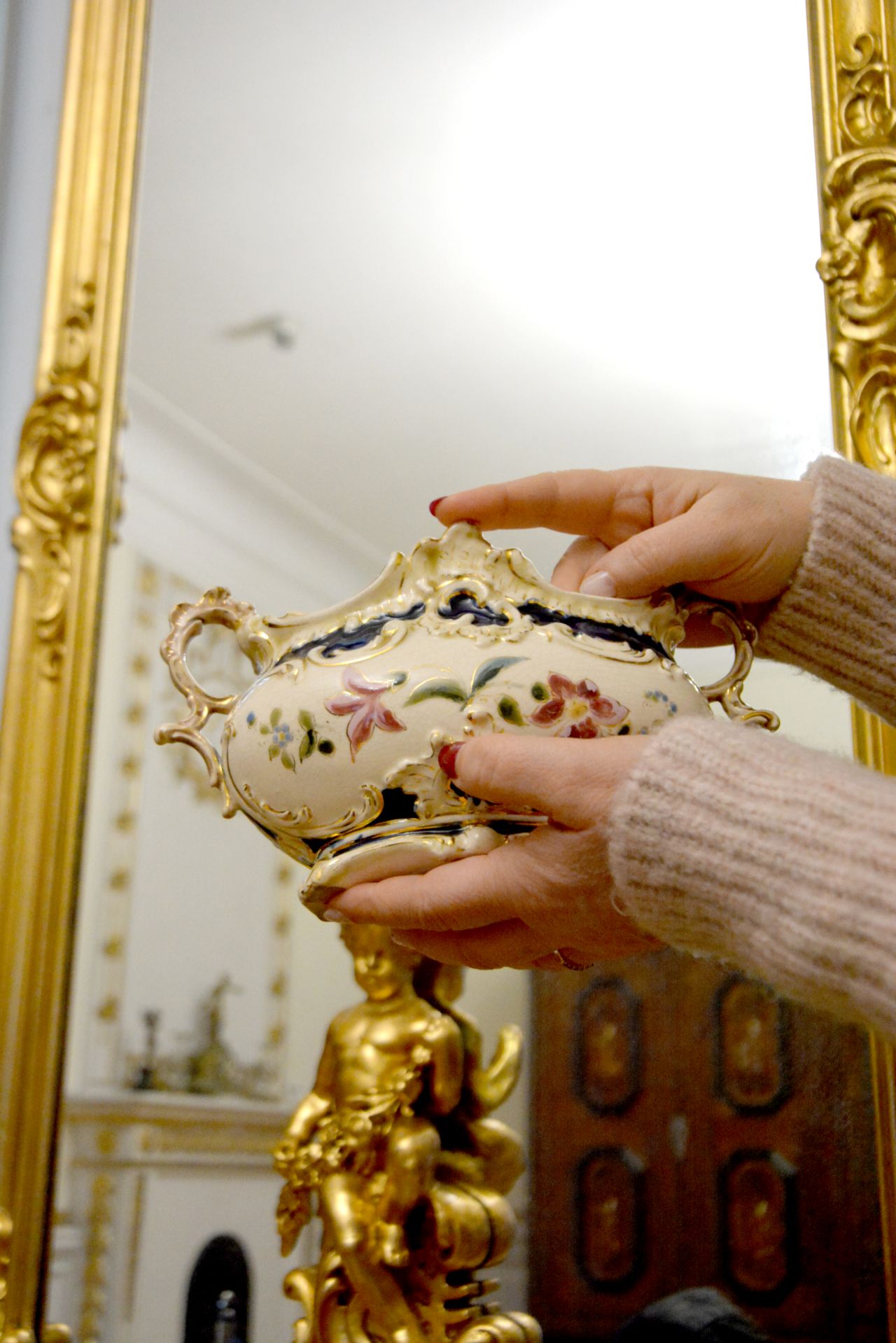 Druga porcelanowa żardiniera jest zadatowana na 1804 r. Ozdobiona złoceniami i subtelną malaturą w formie kwiatów oraz ornamentem małżowinowo-chrząstkowym prezentuje się wytwornie. Jak można się domyślić, nasze „piękności” są odmienne stylowo, dlatego pierwszą można podziwiać w sali jadalni secesyjnej a drugą w sali barokowej.