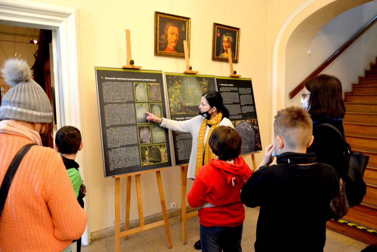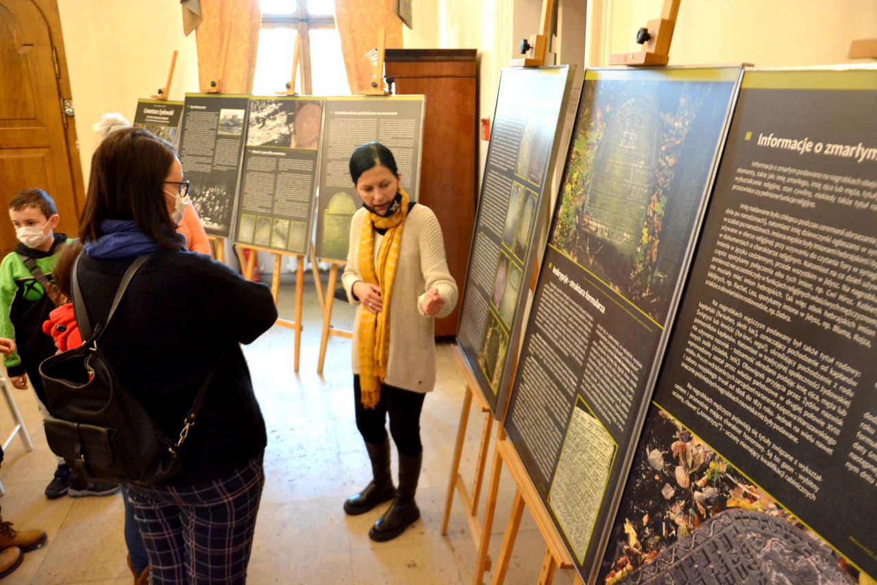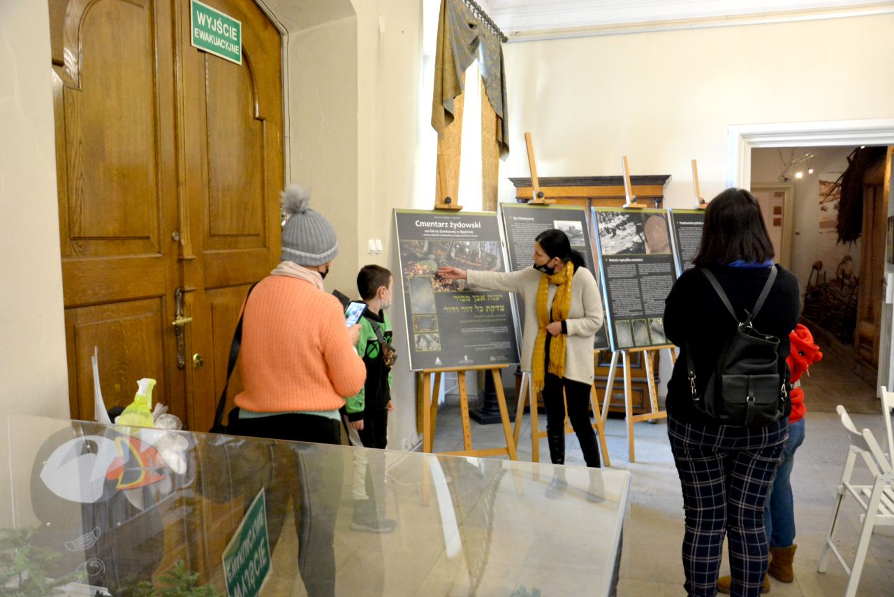 W ostatniej części zajęć pt. „Ta macewa jest świadectwem”, kilku uczestników spotkania skorzystało z możliwości zwiedzania wraz z przewodnikiem wystawy czasowej Cmentarz żydowski w Będzinie - cenny zabytek wielokulturowej przeszłości miasta, powstałej w ramach grantu przyznanego przez SŻIH w Warszawie. Uczestnicy spotkania poznali historię żydowskiej społeczności Będzina oraz najważniejsze zagadnienia związane ze sztuką sepulchralną. Dowiedzieli się jak wygląda tradycyjny nagrobek i o czym mogą świadczyć zdobiące go przedstawienia symboliczne oraz jakie informacje zawierają teksty hebrajskich inskrypcji.