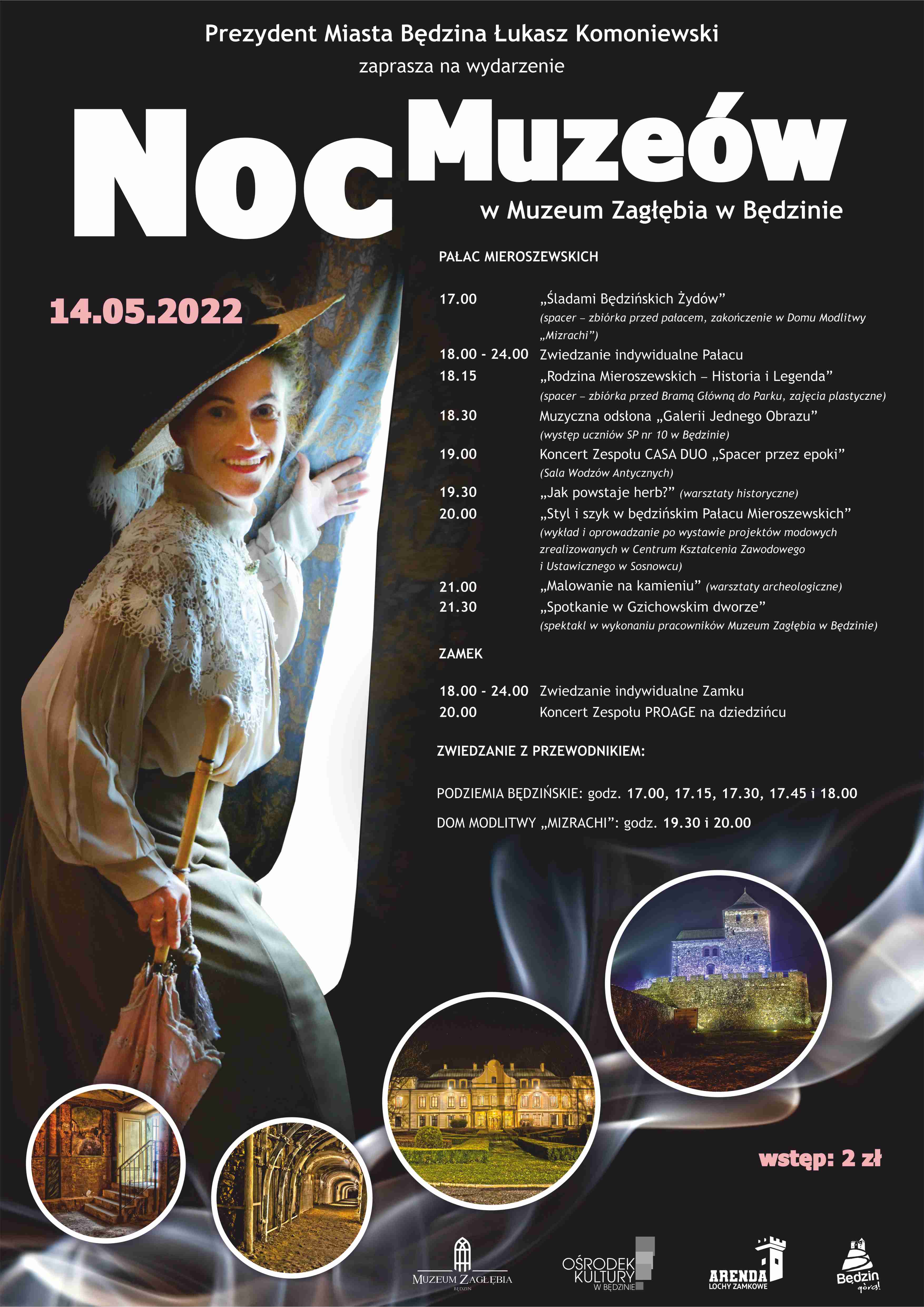Wszystkich, którzy chociaż na chwilę chcą przenieść się w czasie zapraszamy do udziału w tegorocznej edycji Nocy Muzeów. Zwiedzającym udostępniamy Pałac Mieroszewskich, Zamek, Podziemia będzińskie oraz Dom Modlitwy Mizrachi. Na tę jedyną, szczególną noc w roku przygotowaliśmy dla Państwa wiele atrakcji – między innymi spacery historyczne, spektakl teatralny w wykonaniu pracowników Muzeum Zagłębia, koncerty, wykład poświęcony modzie oraz warsztaty plastyczne.
