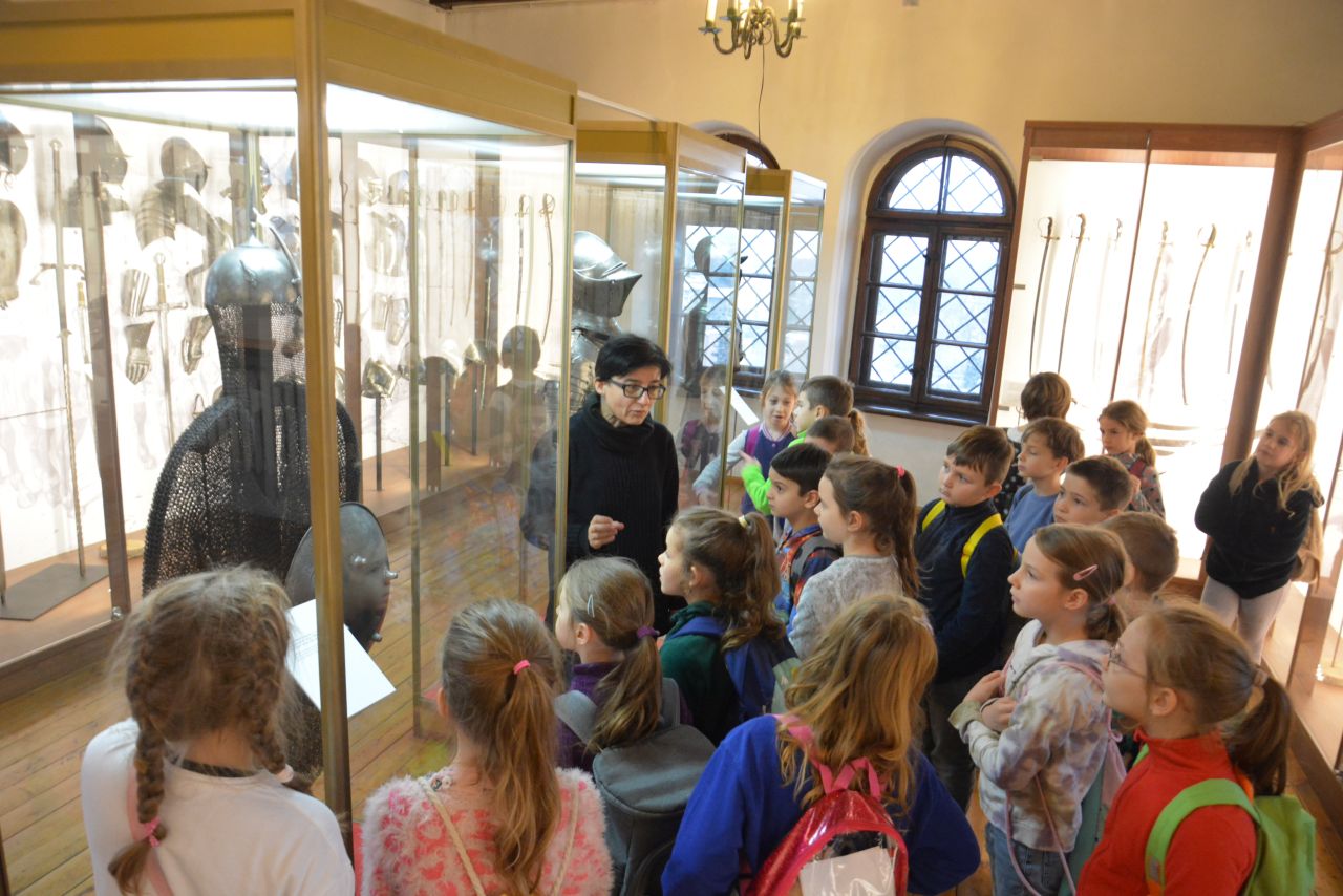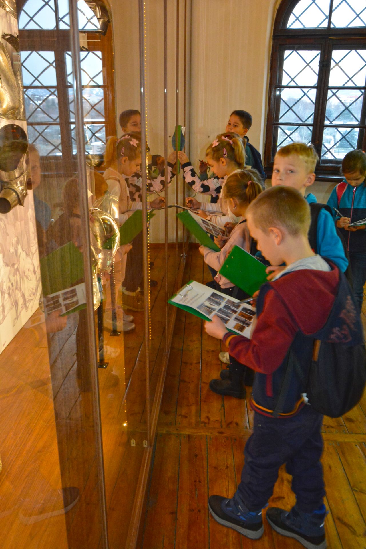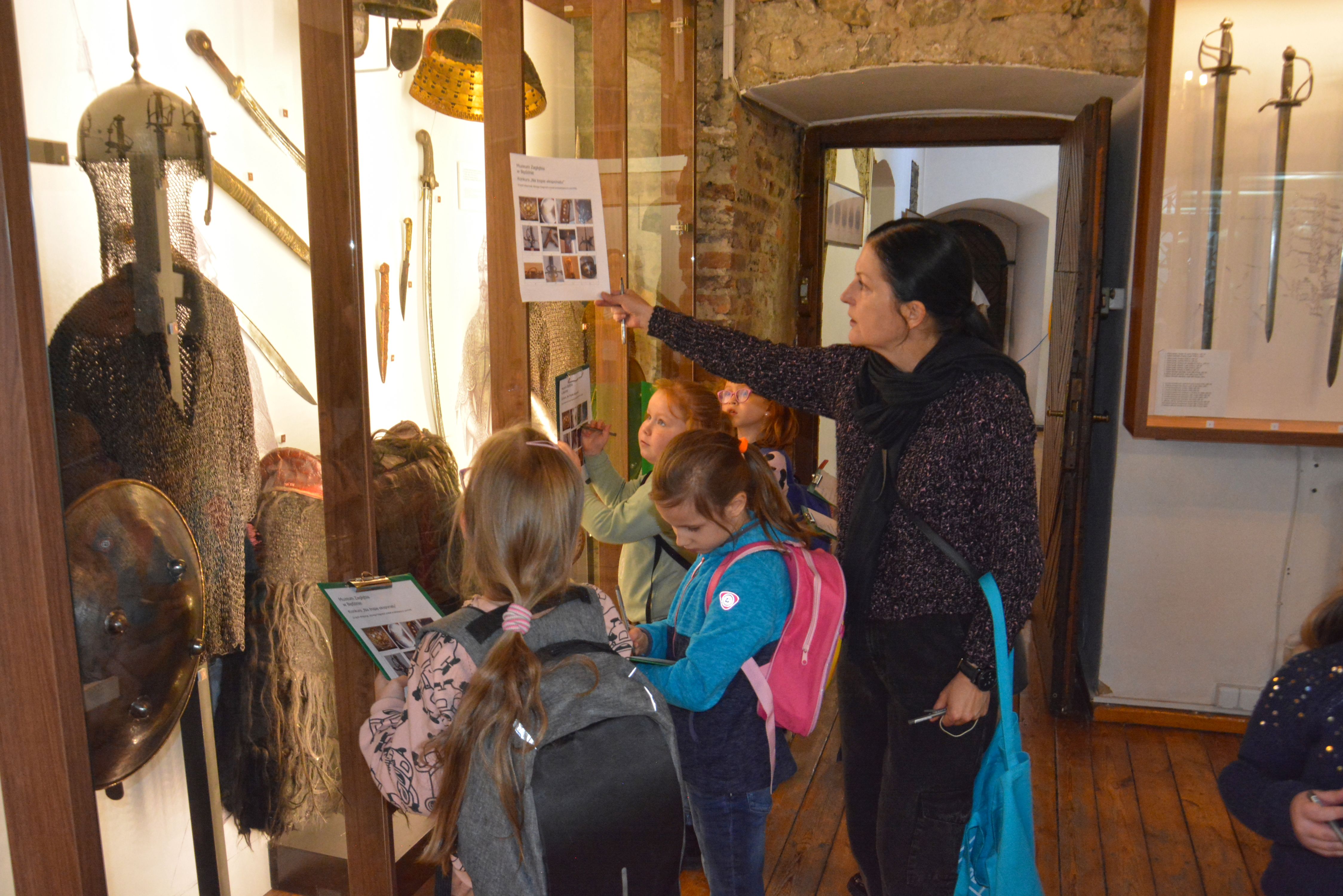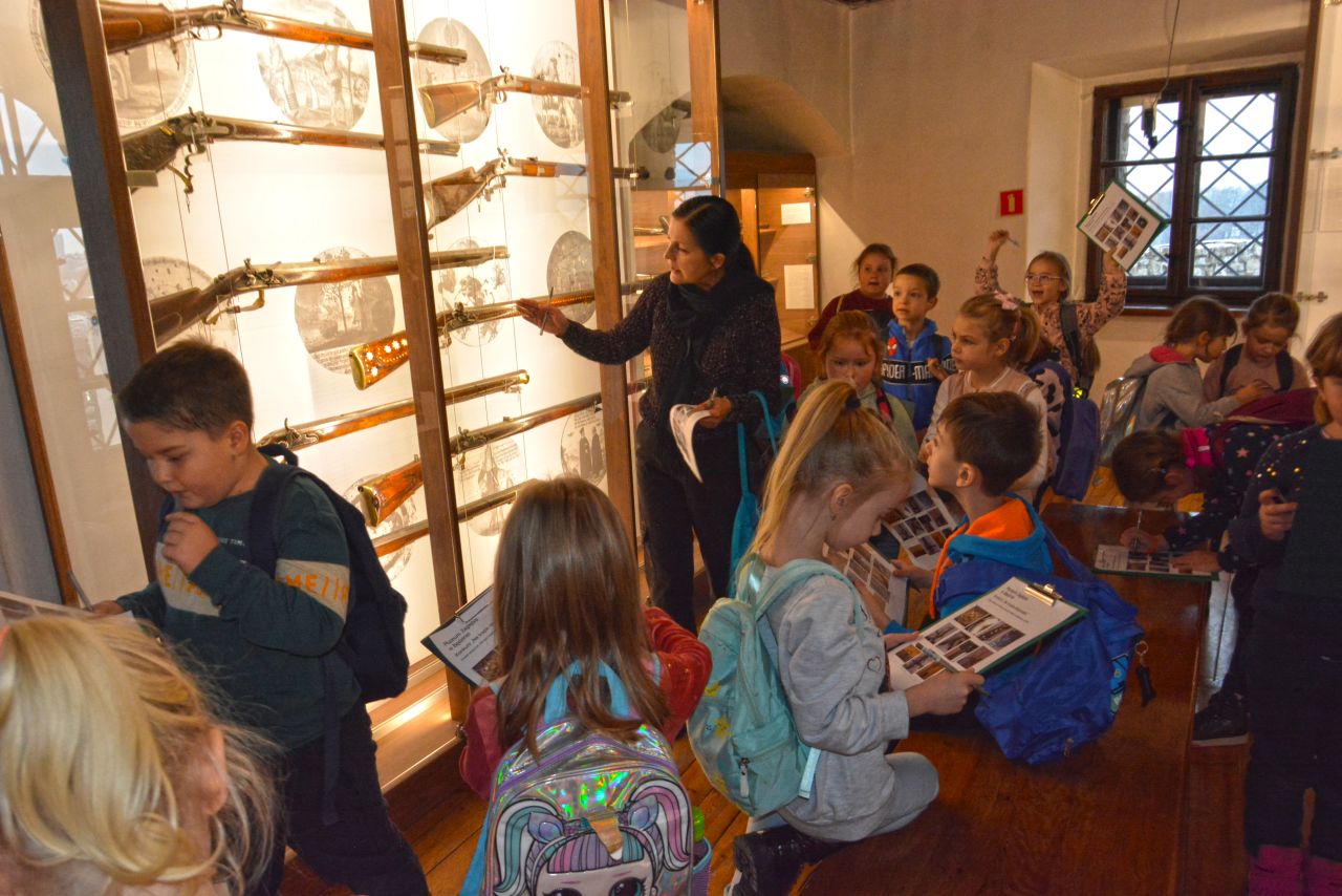 Po zwiedzeniu ekspozycji zamkowej i poznaniu tajników dawnej broni, czekało na nich dość trudne zadanie. Trzeba było odnaleźć na wystawie eksponaty ze zdjęć umieszczonych w ankiecie. Niektóre zdjęcia przedstawiały tylko jakiś detal, fragment eksponatu czy zdobienie. Zajęcia miały uczyć spostrzegawczości i zainteresować dzieci tą trudną jeszcze dla nich tematyką. Uczestnicy zabawy wykazali się jednak ogromnym zaangażowaniem. Wspólnie odnaleźli wszystkie - miecze, rapiery, jatagany, prochownice, ładownice, szyszaki i moriony. Co więcej, sądząc po entuzjazmie z jakim poznawali zbiory zamkowe można przypuszczać, ze wśród nich mógł się znajdować niejeden, wybitny , przyszły polski bronioznawca :-)