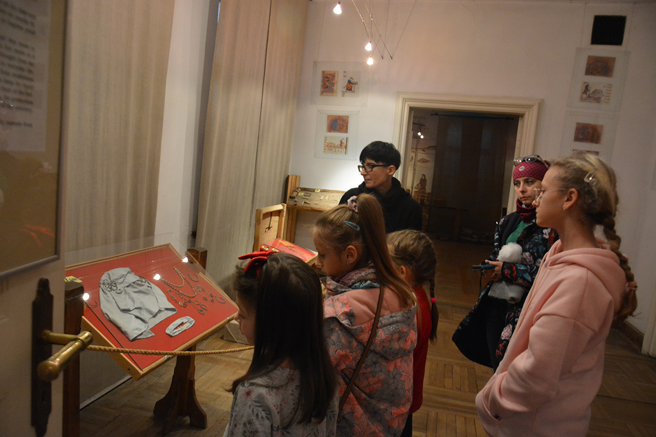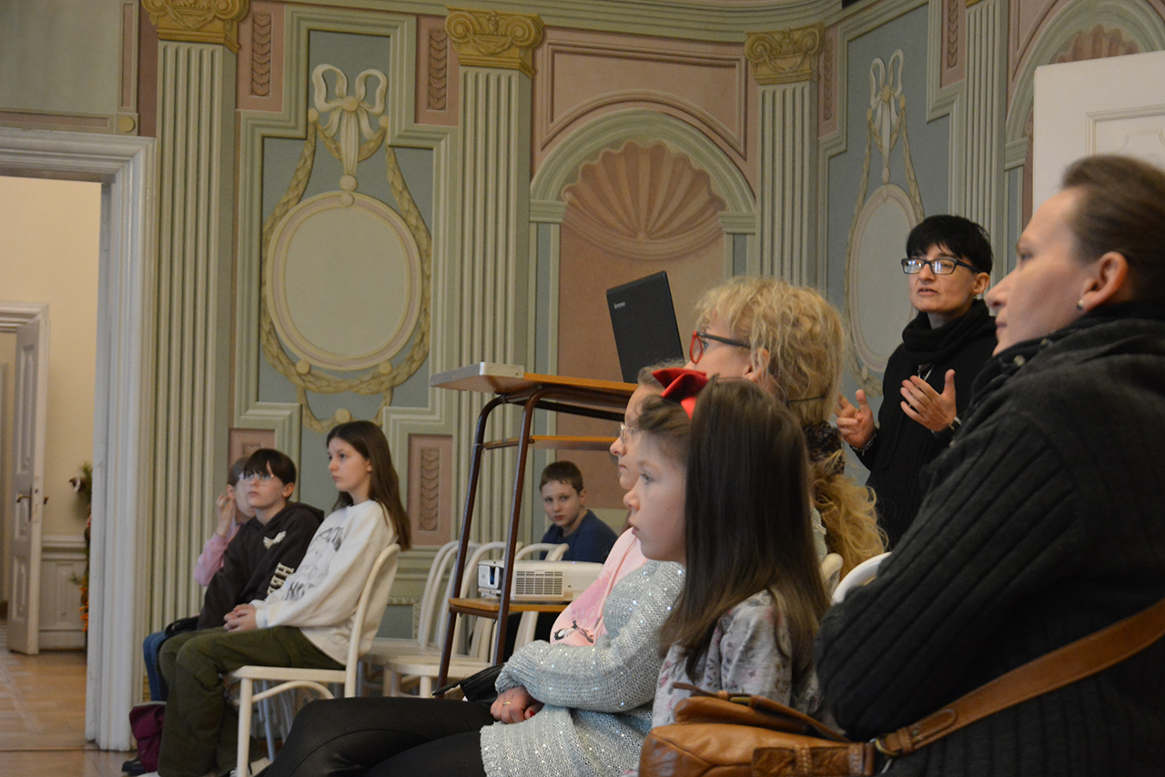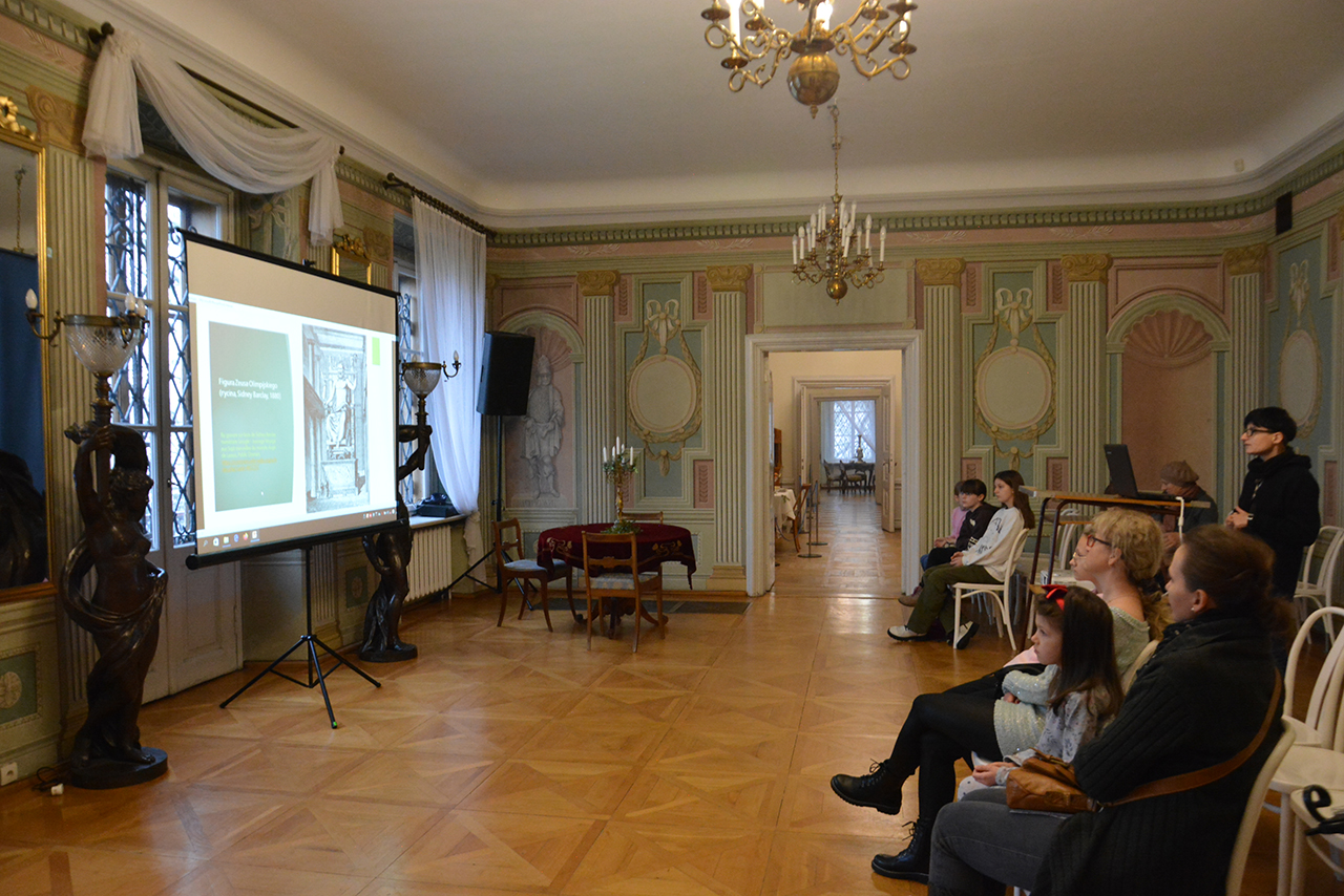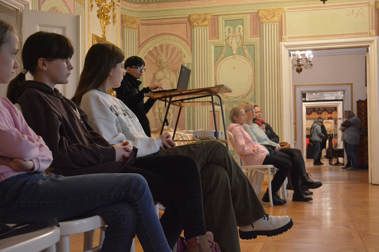 Uczestnicy wysłuchali prelekcji ilustrowanej prezentacją multimedialną zatytułowaną „Skarby starożytności – spotkanie z mitami”. Następnie wzięli udział w warsztatach plastycznych w czasie których wykonywali i ozdabiali pudełka na skarby. Druga część zajęć poświęcona była zwiedzaniu z przewodnikiem wystaw stałych i czasowych w Pałacu Mieroszewskich.