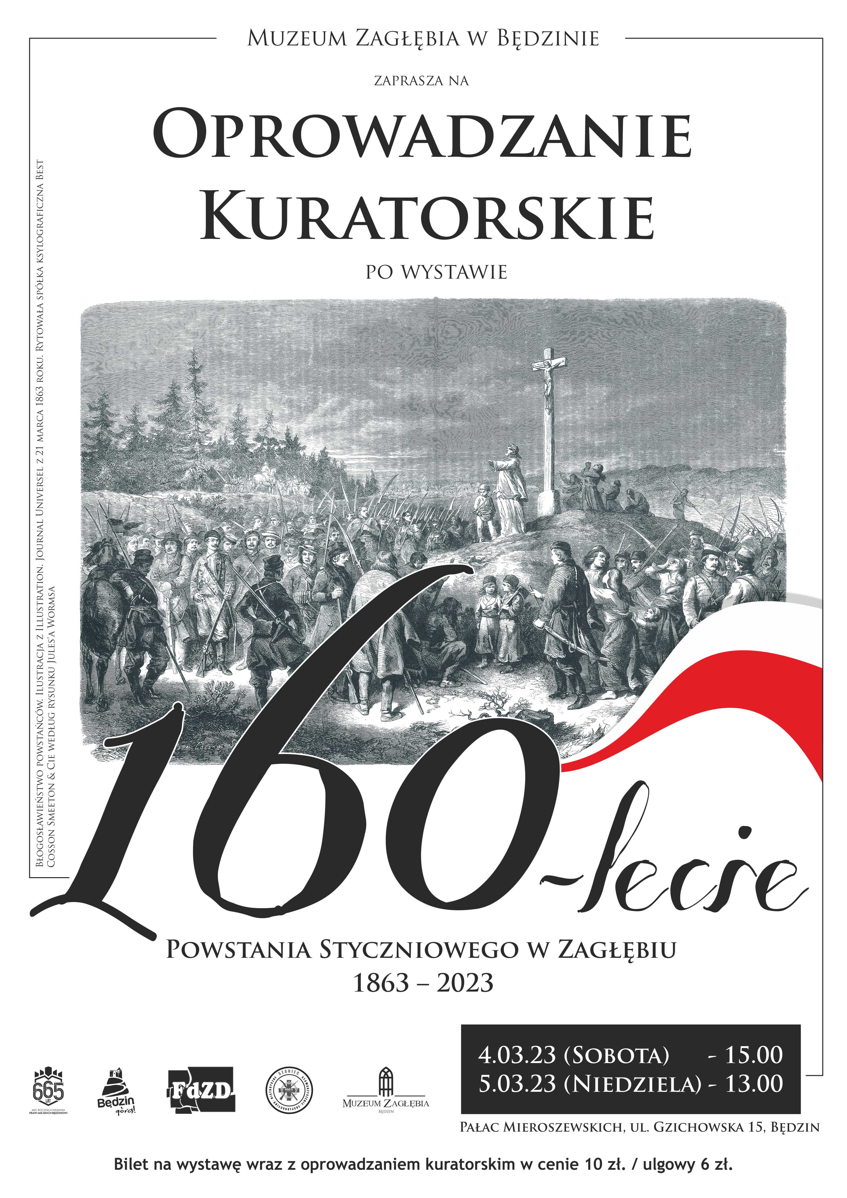 W najbliższą sobotę o godzinie 15:00  i w  niedzielę  o godzinie 13:00 serdecznie zapraszamy do Pałacu Mieroszewskich na oprowadzanie kuratorskie po wystawie "160-lecie Powstania Styczniowego w Zagłębiu 1863-2023".