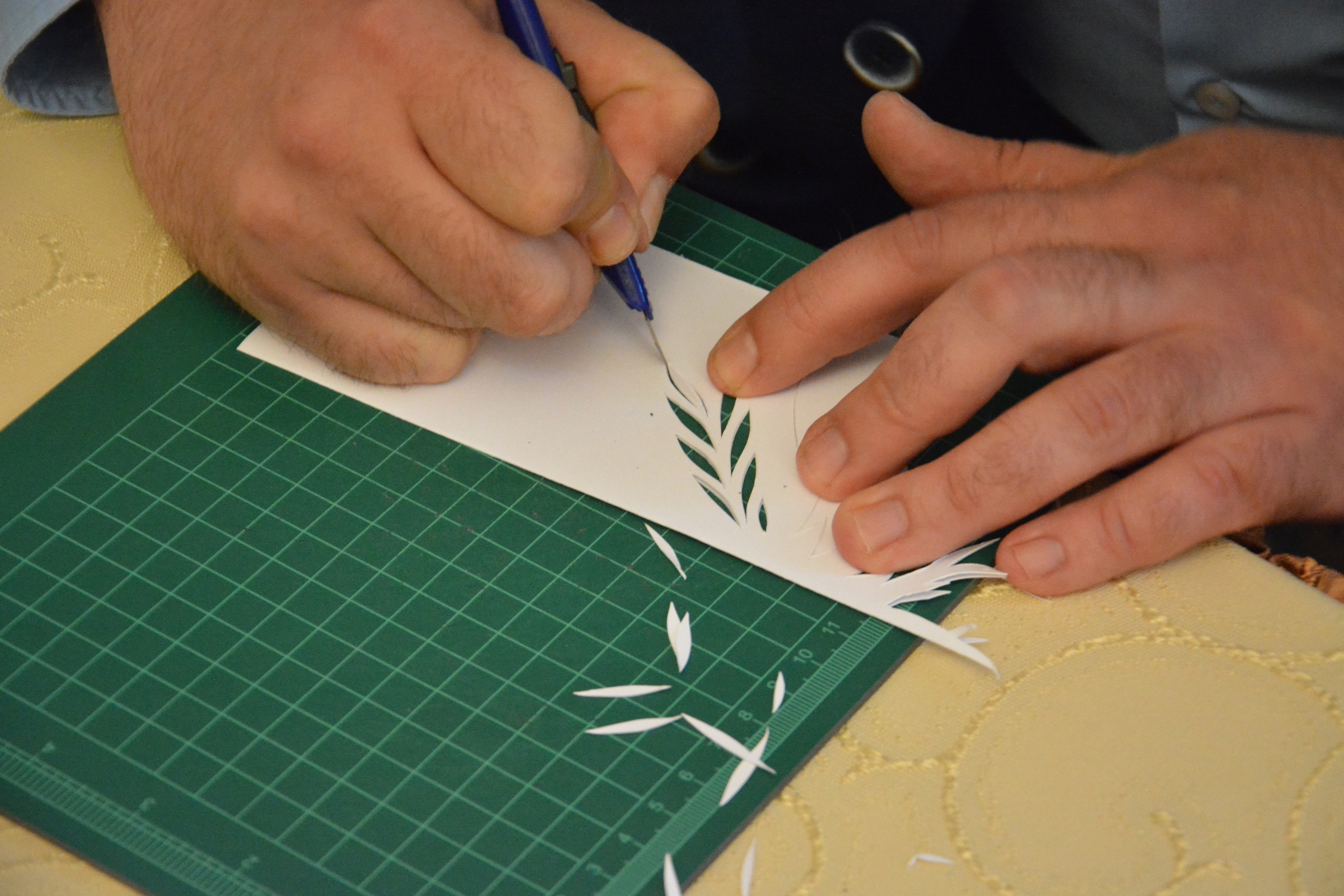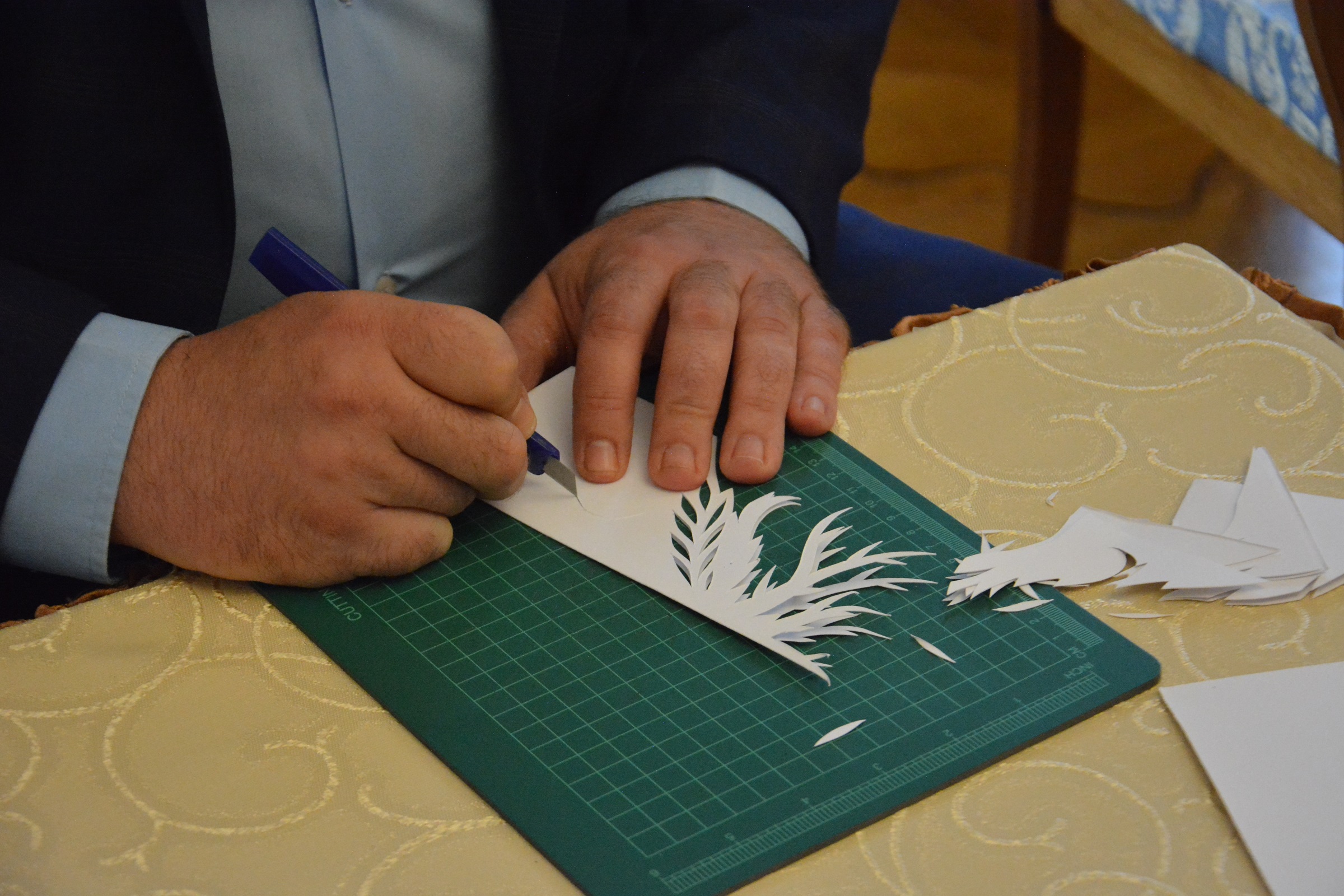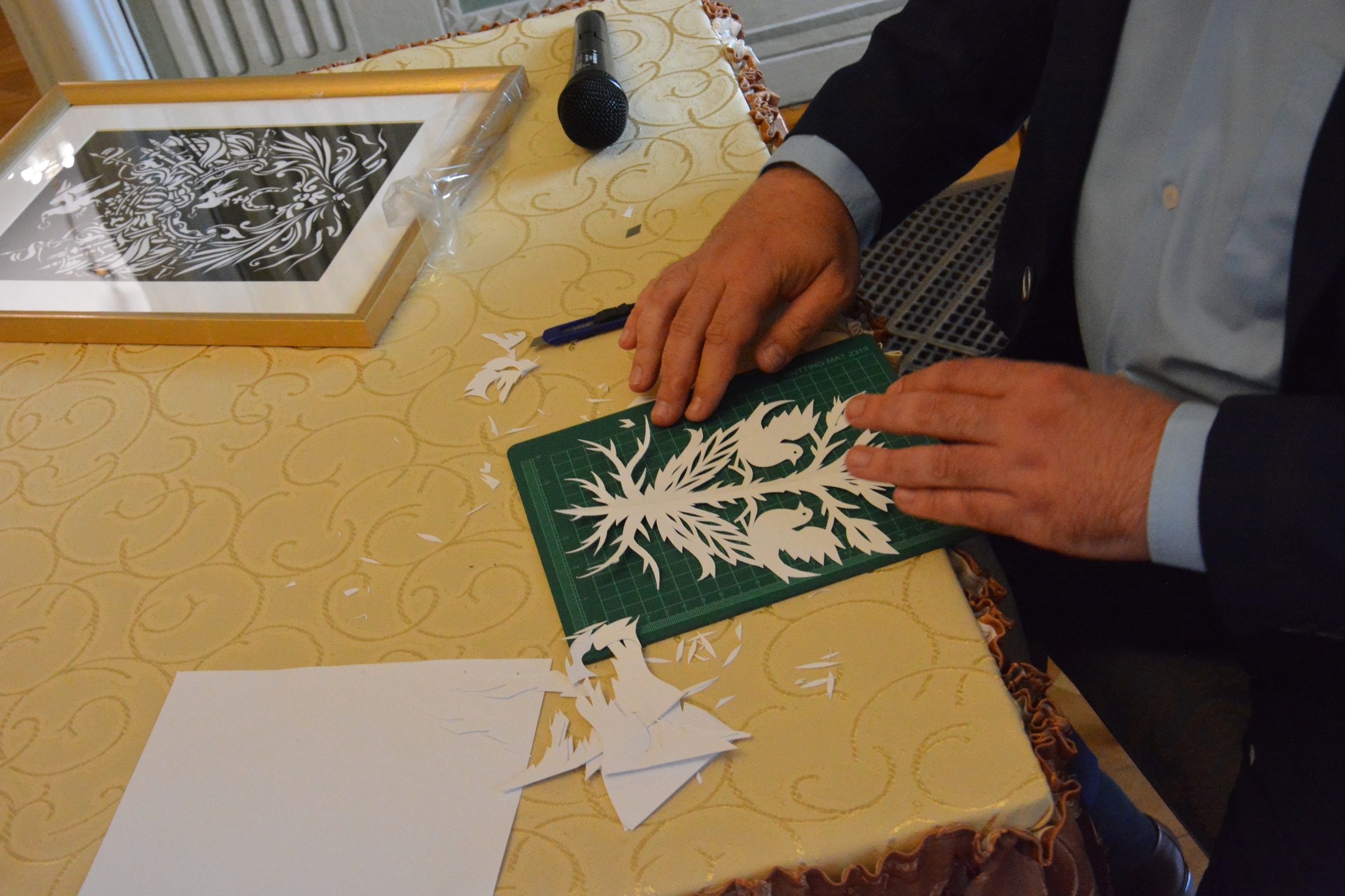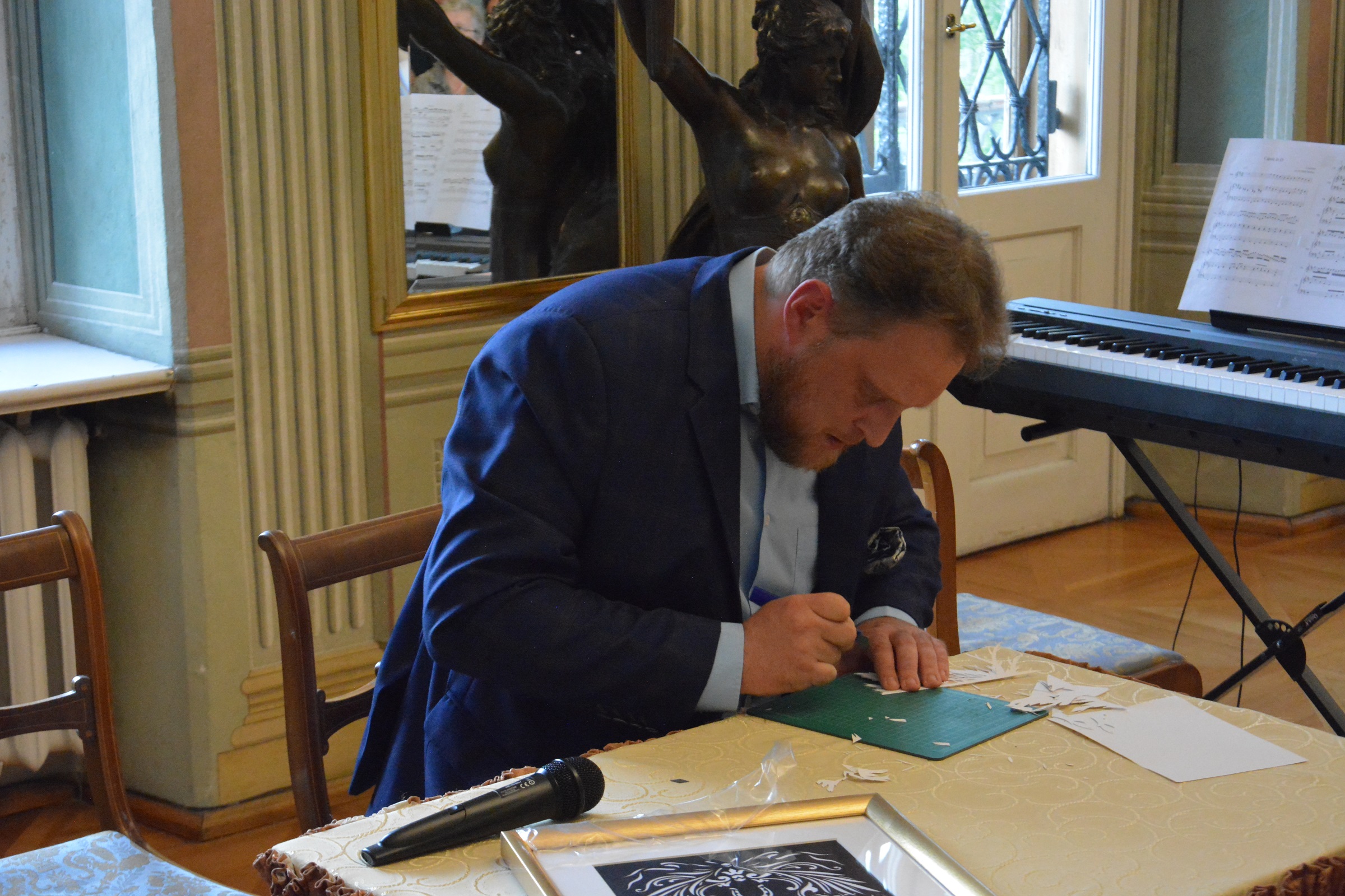 Autor prac interesująco opowiadał o początkach swojej twórczej drogi, tajnikach warsztatu oraz inspiracjach. Artysta zademonstrował publiczności jak wygląda jego praca wykonując wycinankę. Odbyło się także wspólne zwiedzanie wystawy. Spotkanie dopełnił akcent muzyczny w wykonaniu Tatjany Shvets oraz Daniela Martíneza Gómez.