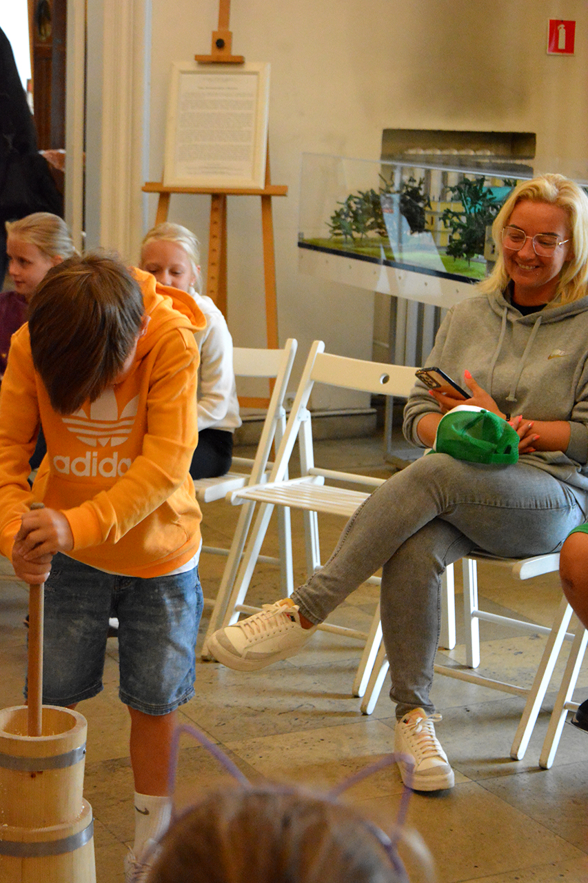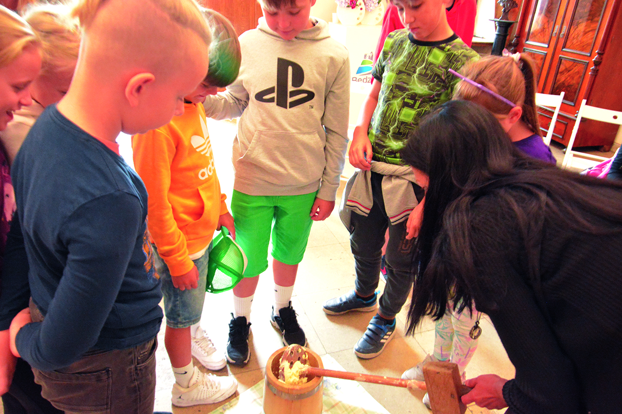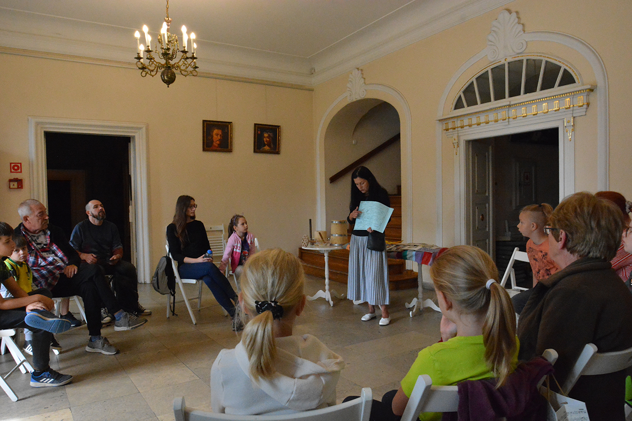 Uczestnicy Środowych Spotkań w Muzeum Zagłębia w pierwszej części dzisiejszego spotkania poznawali życie w zagłębiowskiej chacie – nie tylko zwiedzili wystawę, obejrzeli używane dawniej sprzęty i narzędzia gospodarskie, takie jak żelazka na duszę, maglownicę, lampę naftową, pług, cep, żarna, itp., ale też własnoręcznie ubili masło w maselnicy tłuczkowej.