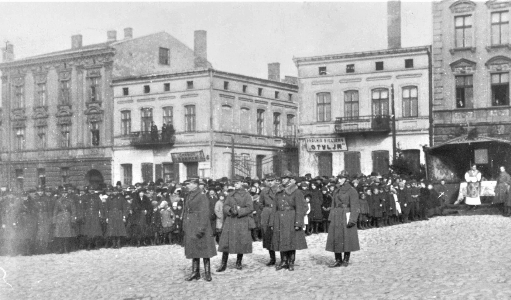 Dowództwo 11 PP, Będzin Plac 3 Maja, w tle widoczna brama do przejścia na ulicę Kołłątaja oraz szyld pralani Otylia, 1921 r., ze zbiorów Muzeum Zagłębia w Będzinie