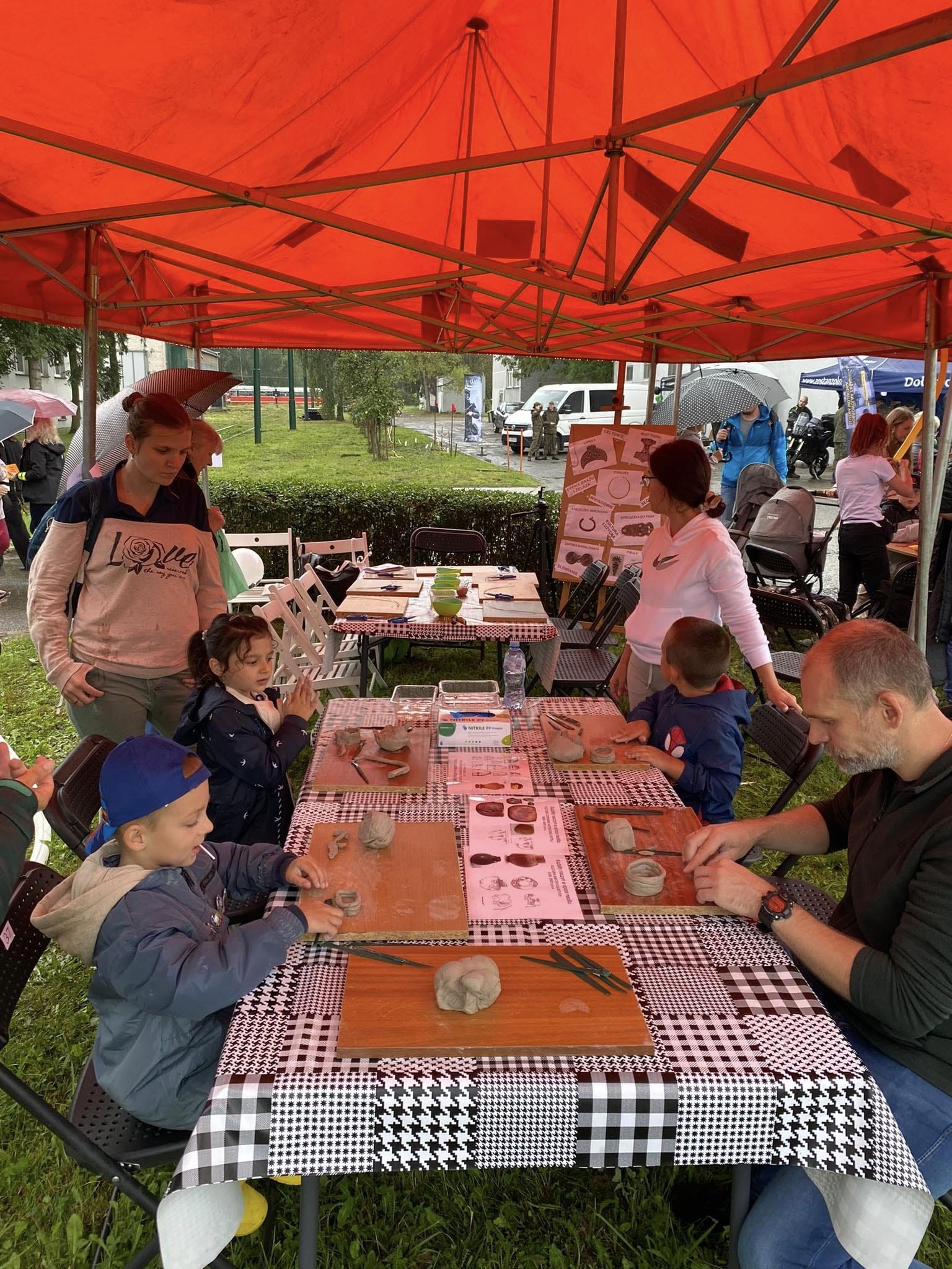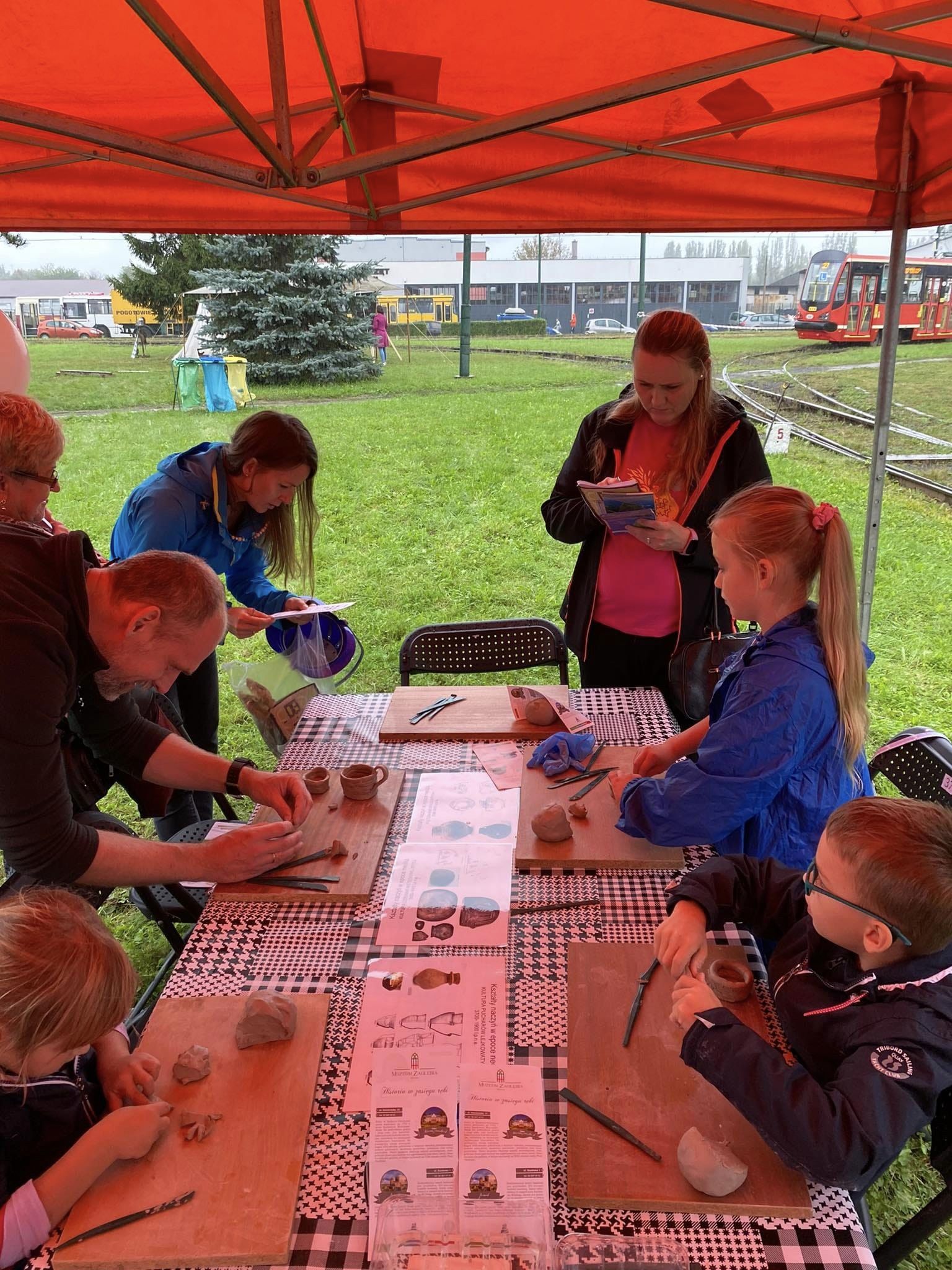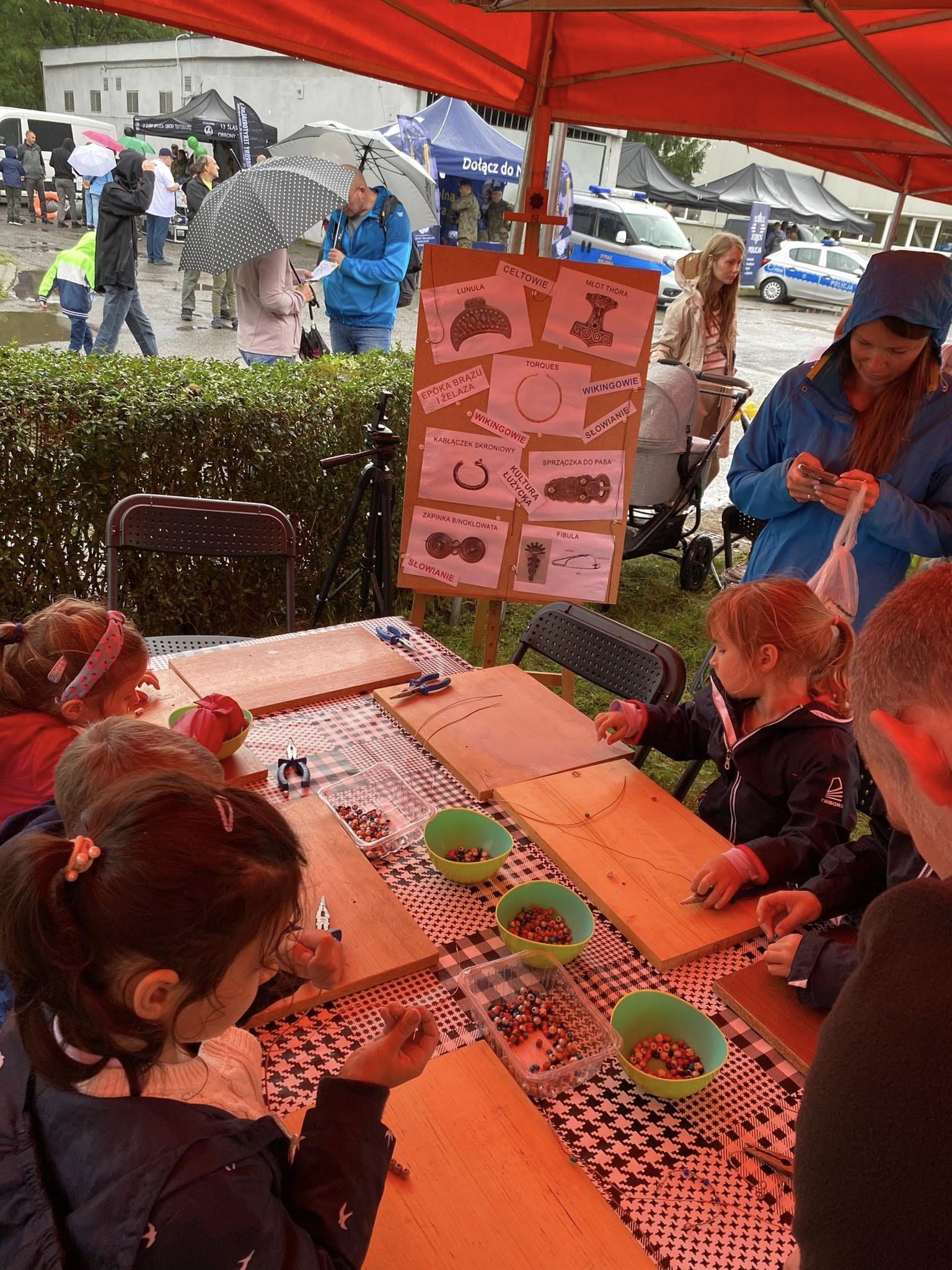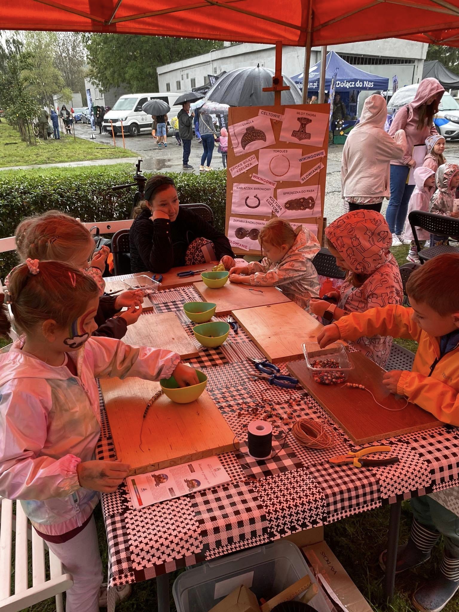 Podczas warsztatów #MuzeumZagłębiawBędzinie młodzi uczestnicy mogli dowiedzieć się jak ważną rolę w starożytnym świecie odgrywała biżuteria, która w ówczesnym świecie była niemalże obowiązkowa. Następnie każdy mógł wykonać ozdobę dla siebie. W drugiej części naszego stoiska królowało neolityczne garncarstwo, gdzie dzieci mogły puścić wodze wyobraźni przy ręcznym lepieniu naczyń. Tutaj forma była dowolna, co skutkowało powstawaniem wyjątkowych i niepowtarzalnych kształtów.