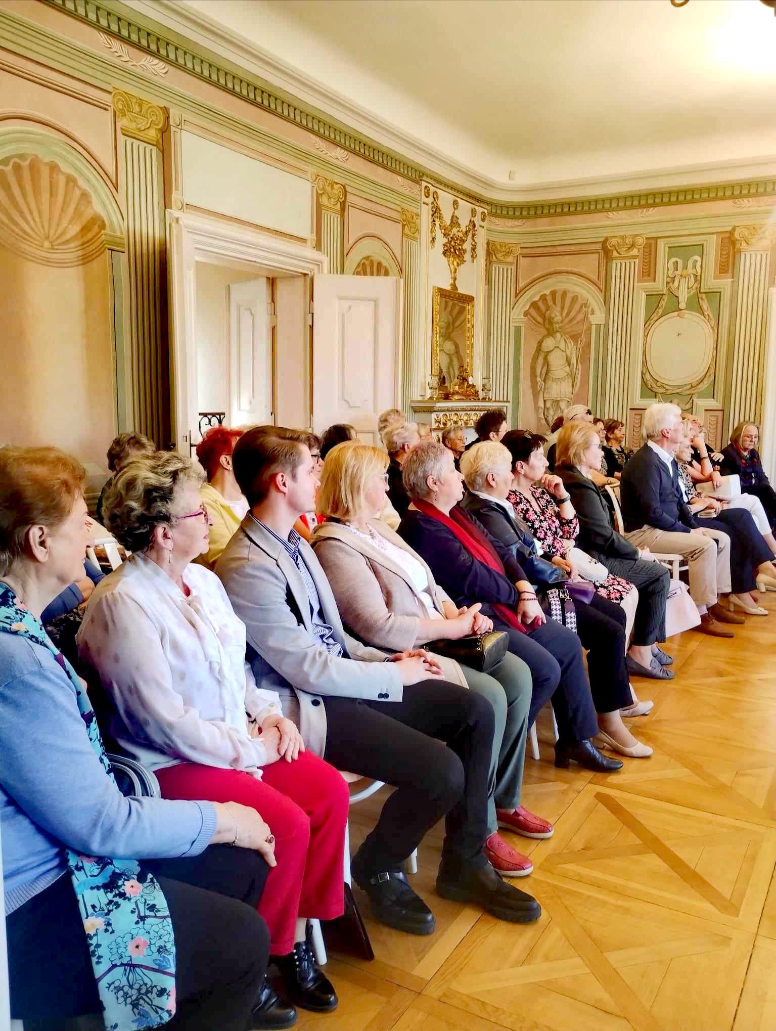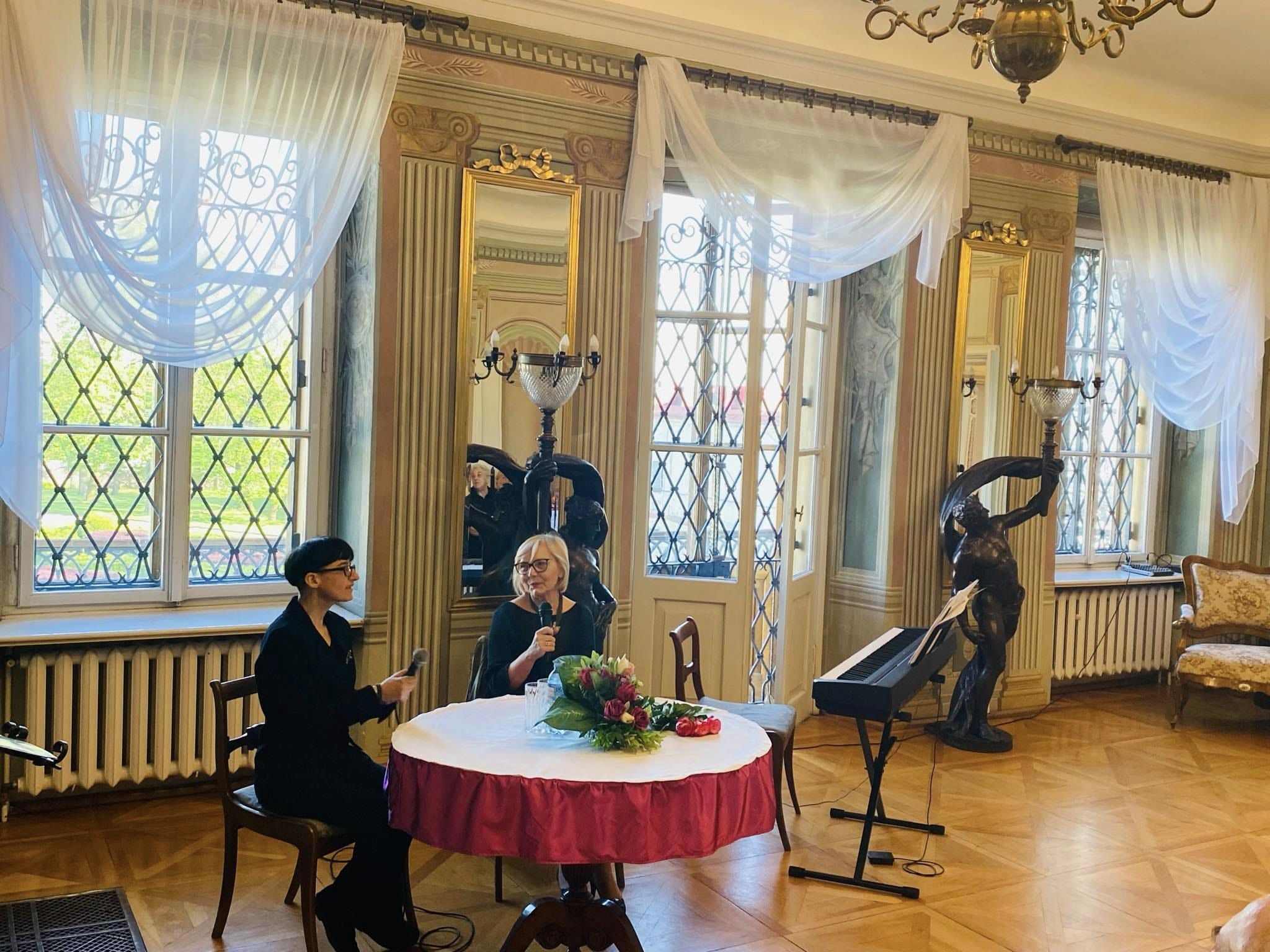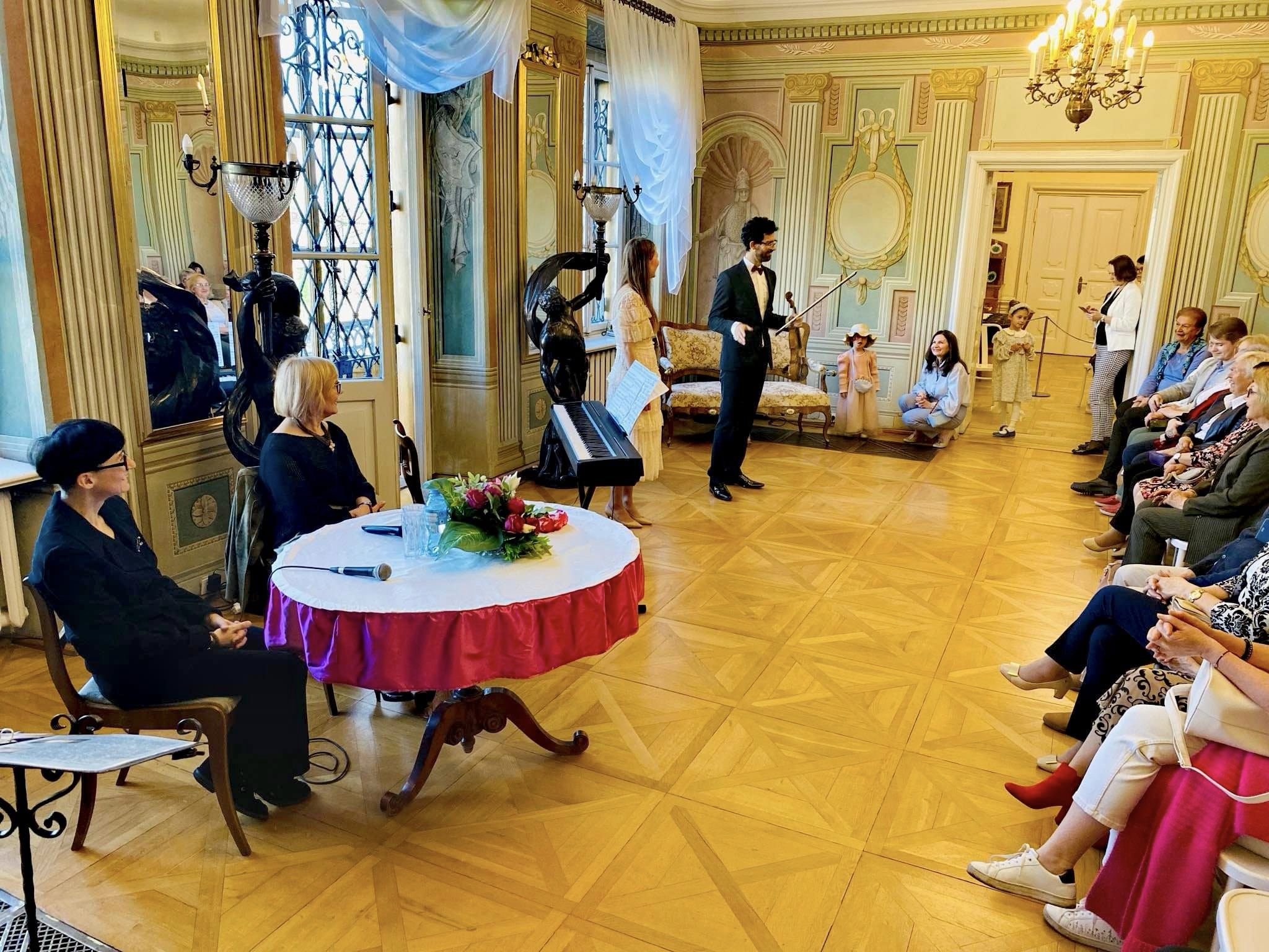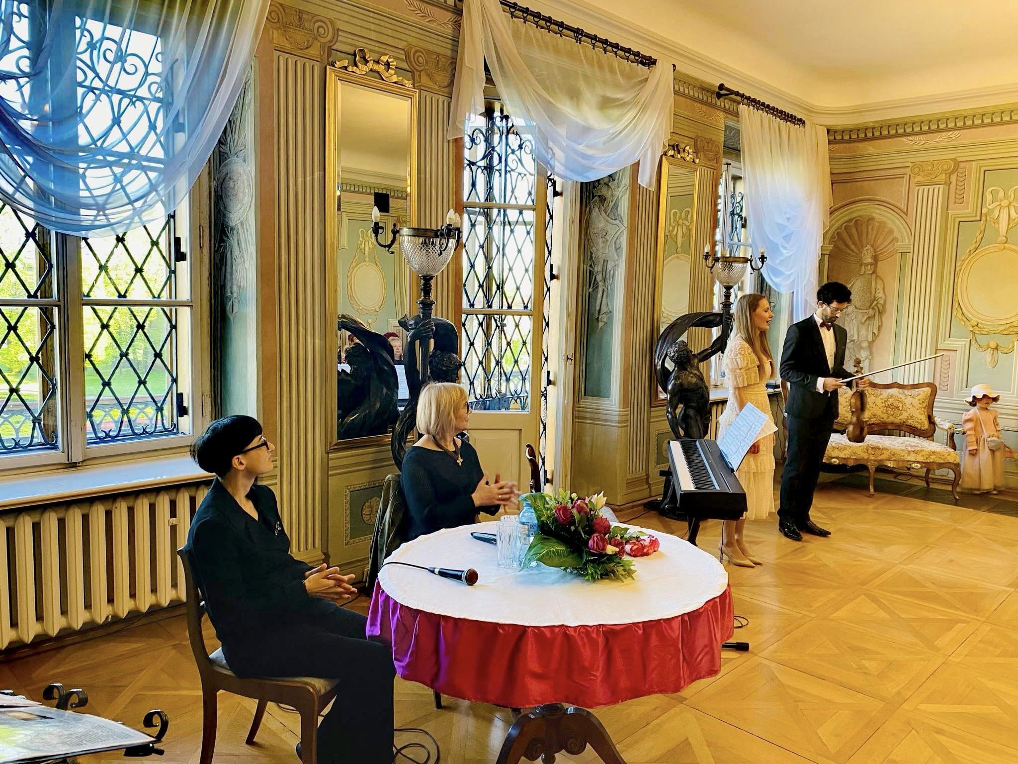 Goście przybyli na wernisaż mieli okazję dowiedzieć się, jak rozpoczęła się przygoda Artystki ze sztuką a także co wspólnego ma budowa maszyn z malarstwem. Wydarzenie uświetnił występ polsko – hiszpańskiego duetu Claro de Luna. Dużą atrakcją było także zwiedzanie wystawy w towarzystwie Autorki oraz poznanie źródeł inspiracji dla jej niezwykłych prac. To było piękne popołudnie – przykuwające uwagę dzieła plastyczne, doskonała harmonia dźwięków, Pałac Mieroszewskich otoczony świeżą, wiosenną zielenią oraz Państwa obecność – za to szczególnie dziękujemy.