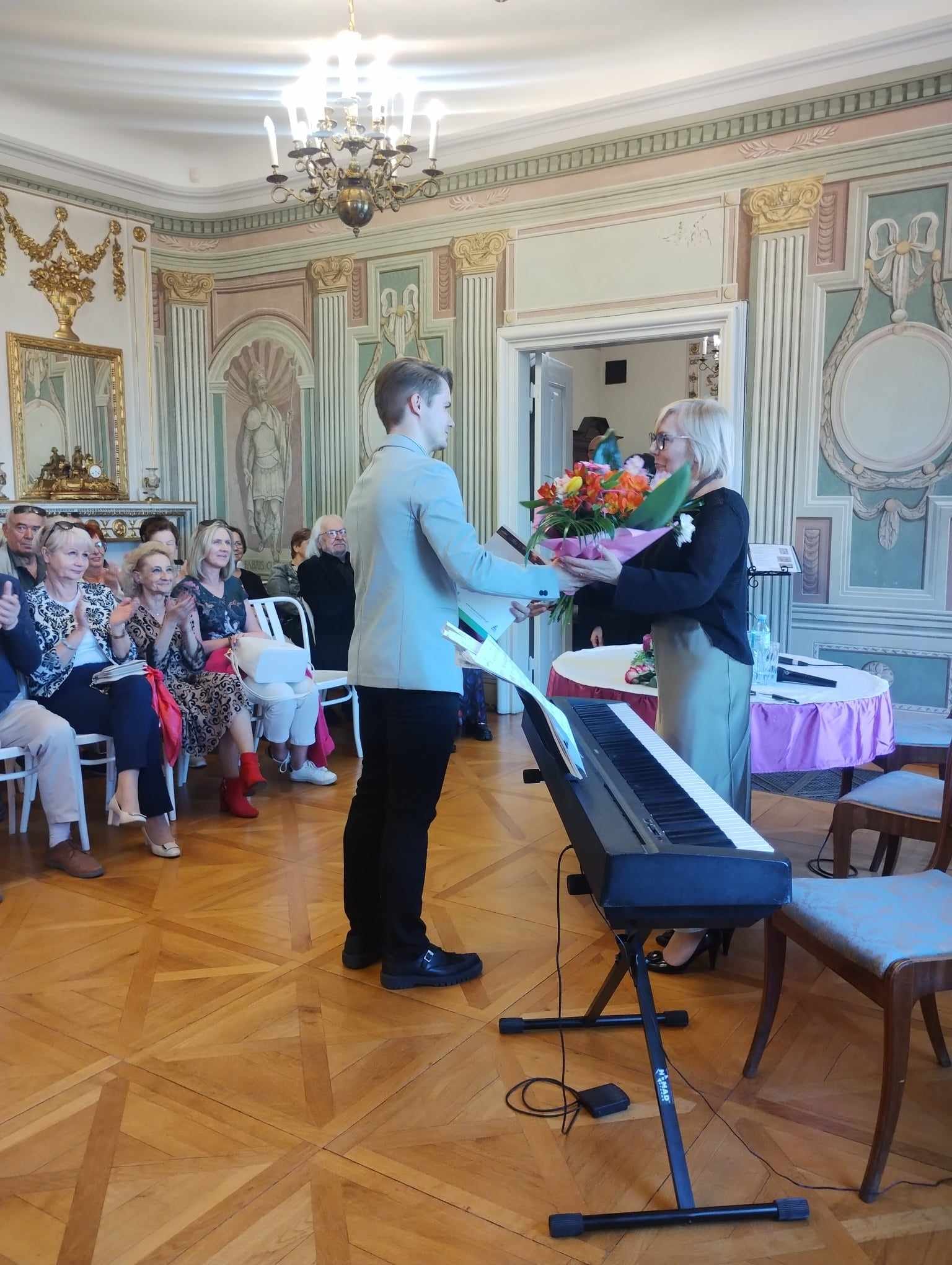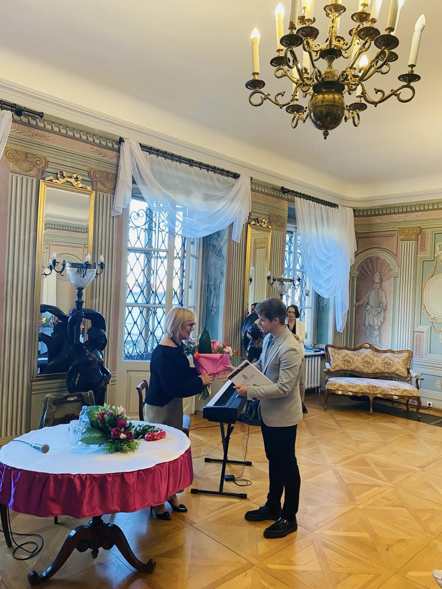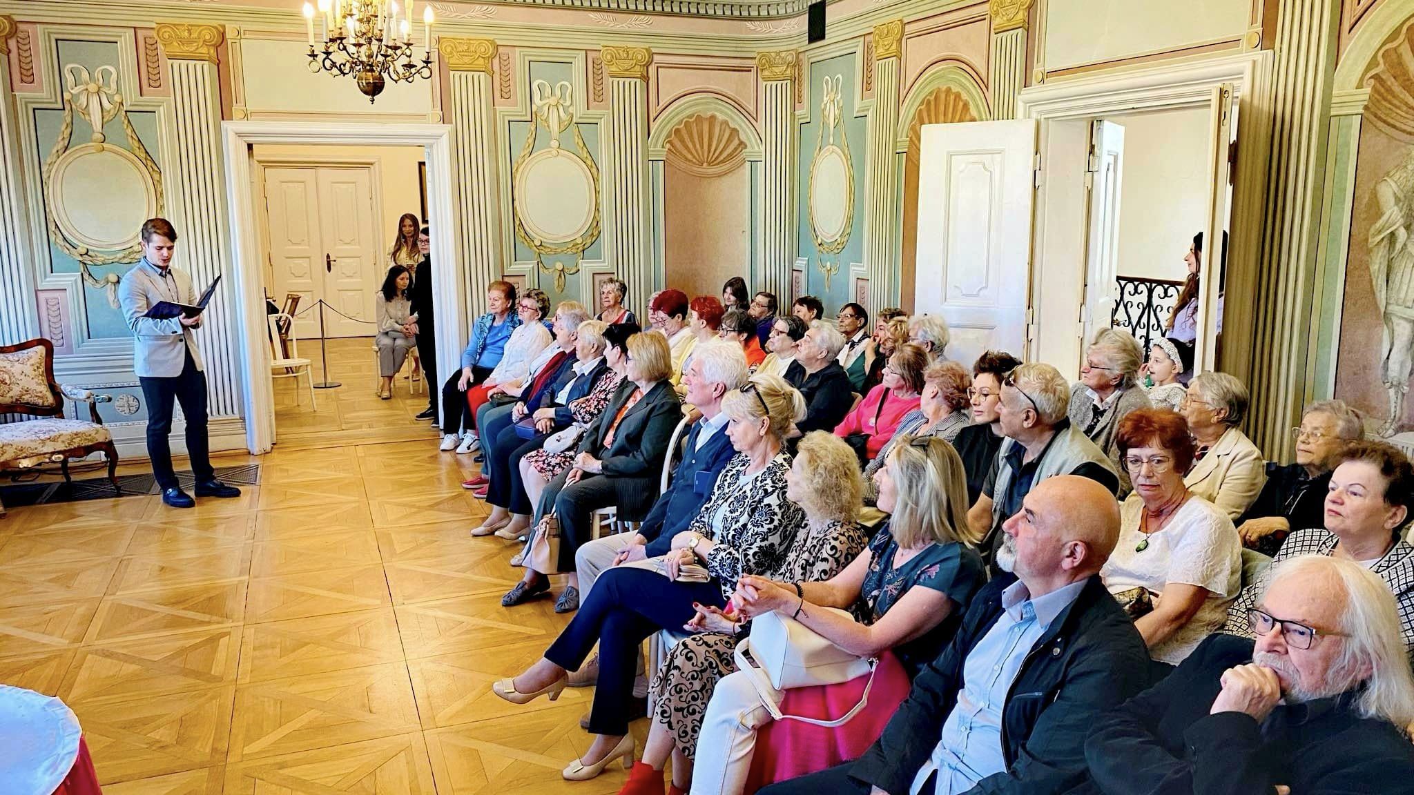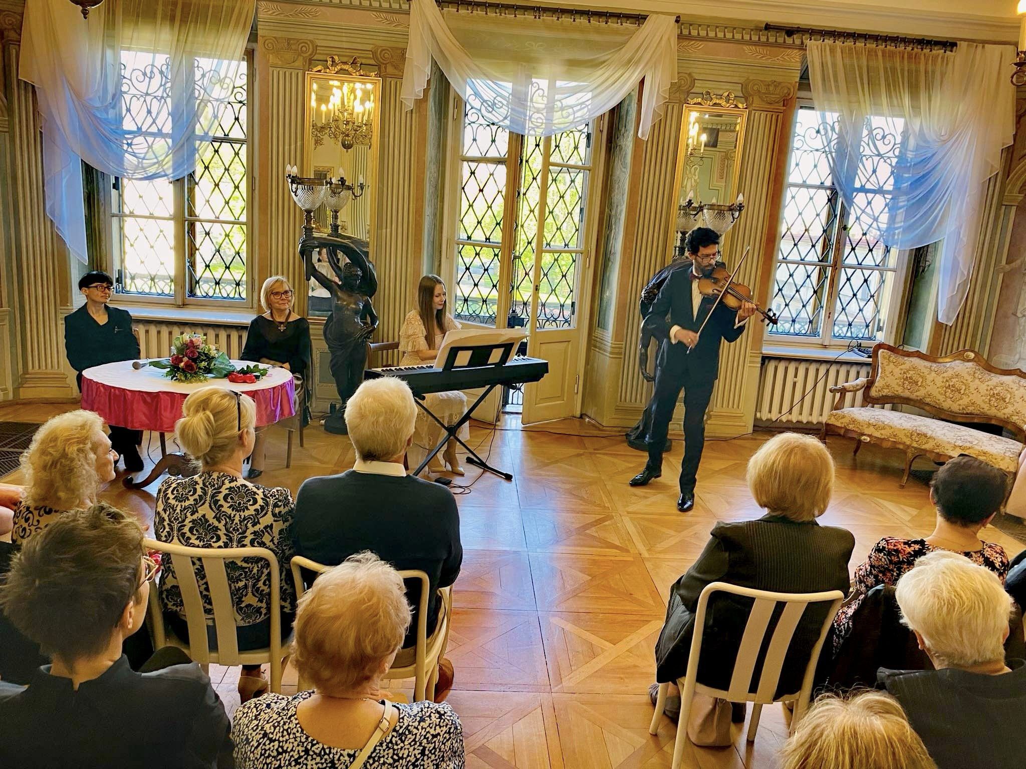 Goście przybyli na wernisaż mieli okazję dowiedzieć się, jak rozpoczęła się przygoda Artystki ze sztuką a także co wspólnego ma budowa maszyn z malarstwem. Wydarzenie uświetnił występ polsko – hiszpańskiego duetu Claro de Luna. Dużą atrakcją było także zwiedzanie wystawy w towarzystwie Autorki oraz poznanie źródeł inspiracji dla jej niezwykłych prac. To było piękne popołudnie – przykuwające uwagę dzieła plastyczne, doskonała harmonia dźwięków, Pałac Mieroszewskich otoczony świeżą, wiosenną zielenią oraz Państwa obecność – za to szczególnie dziękujemy.