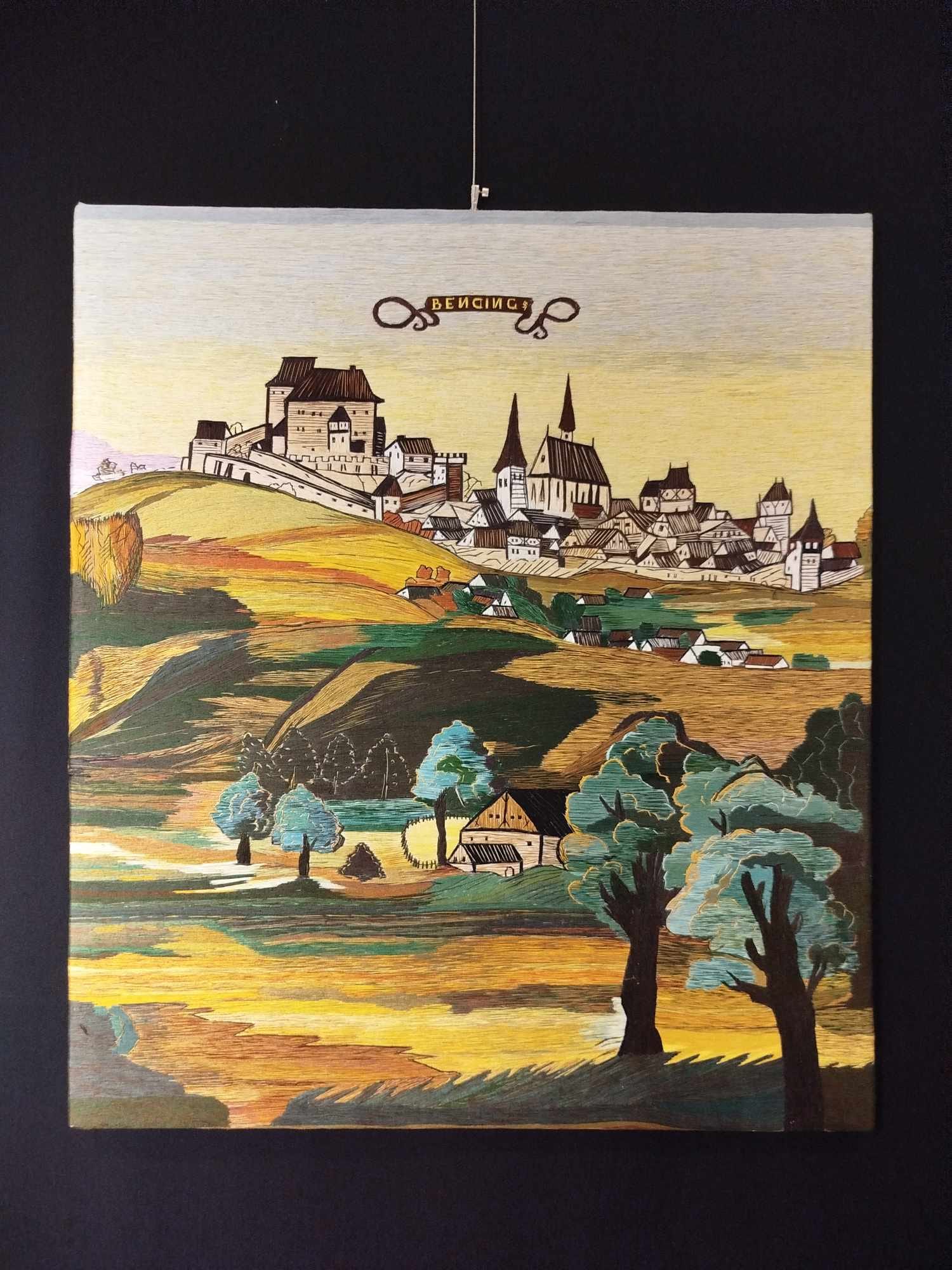 Opis fotografii: Widok Będzina na podstawie weduty Matthiasa Gerunga, Teresa Orłowska, 2023 r. Eksponat z wystawy czasowej „Haftowane gobeliny” w Pałacu Mieroszewskich.