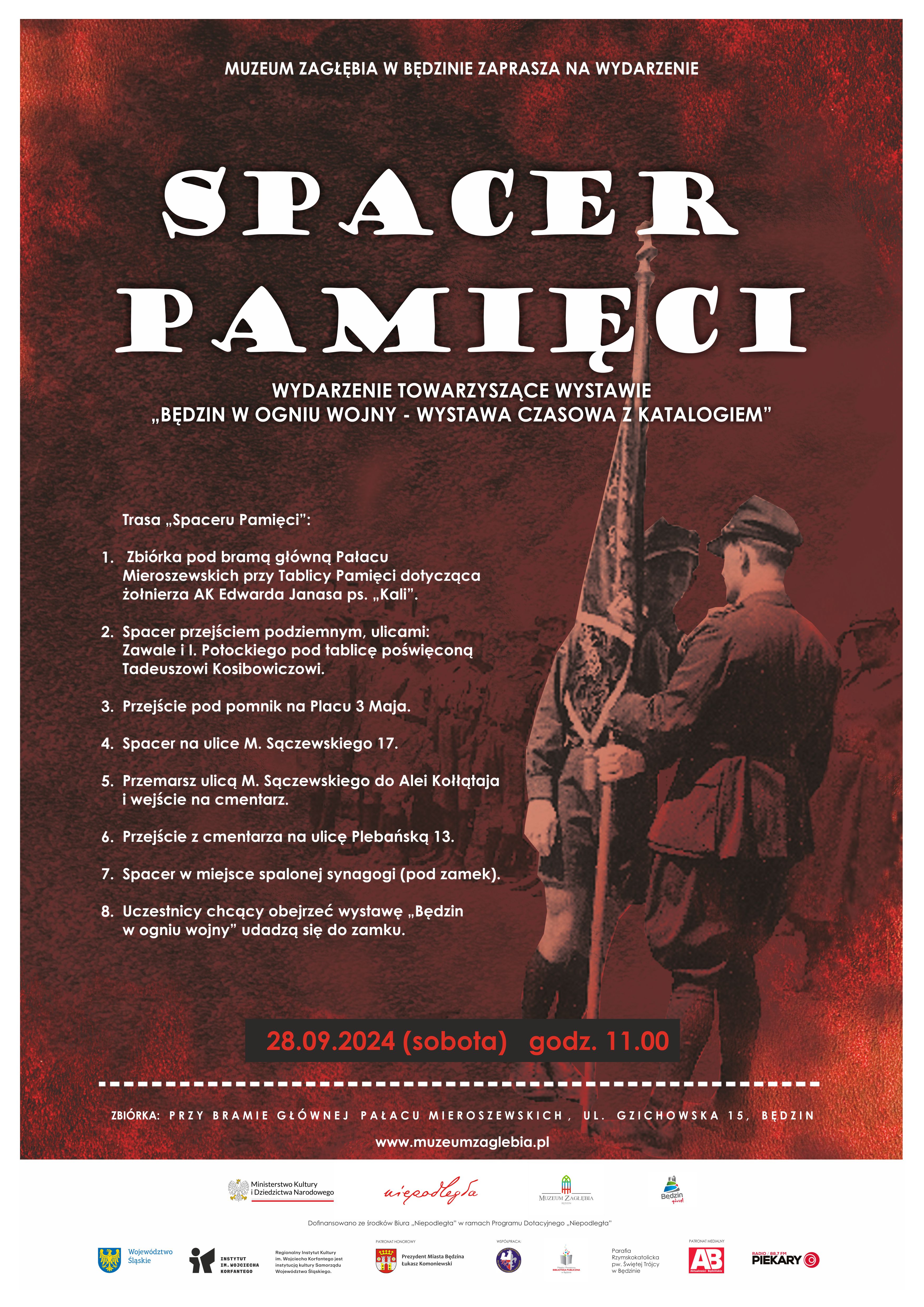 28 września 2024 roku (sobota) zapraszamy wszystkich mieszkańców Będzina i okolic na „Spacer Pamięci”. Wydarzenie jest związane z 85 rocznicą wybuchu II wojny światowej, która została upamiętniona na wystawie „Będzin w ogniu wojny” eksponowanej w będzińskim zamku.