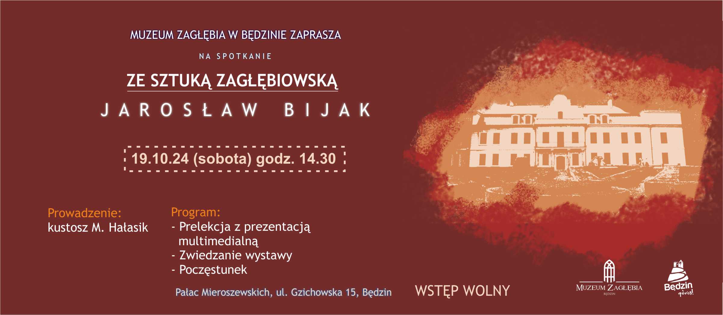 W najbliższą sobotę (19 października) zapraszamy do Pałacu Mieroszewskich na wydarzenie kulturalne podczas którego odbędzie się prelekcja na temat legendarnej „Grupy Zagłębie” i należącego do niej Artysty Plastyka – Jarosława Bijaka.