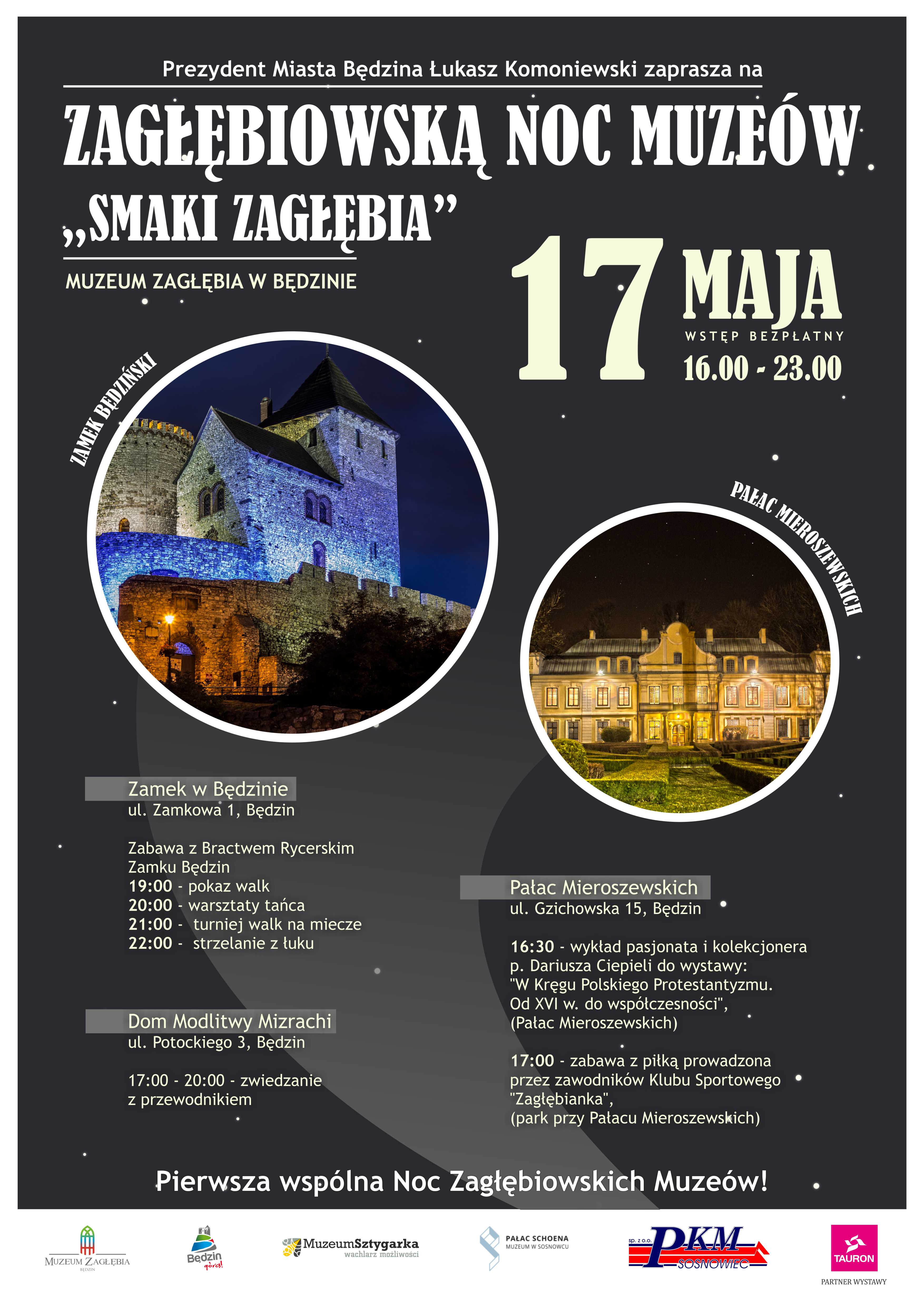 W tym roku, po raz pierwszy, wspólnie z Pałacem Schoena. Muzeum w Sosnowcu i Muzeum Sztygarka w Dąbrowie Górniczej. To już 17 maja! W Będzinie starujemy o godz. 16.00 i bawimy się do godz. 23.00. Sprawdźcie, co dla Was przygotowaliśmy. Pomyśleliśmy o wszystkim. Już nie musicie martwić się o szybkie dotarcie na miejsce interesującej Was atrakcji. Specjalnie dla Was sosnowiecki PKM podstawi bezpłatny autobus, łączący wszystkie trzy muzea. Czas zacząć odliczanie do Zagłębiowskiej Nocy Muzeów!