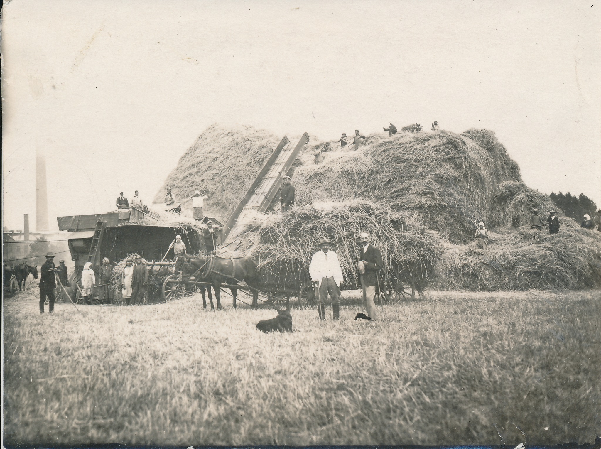 Fotografia: Młócka zboża w gospodarstwie gzichowskim, dwudziestolecie międzywojenne