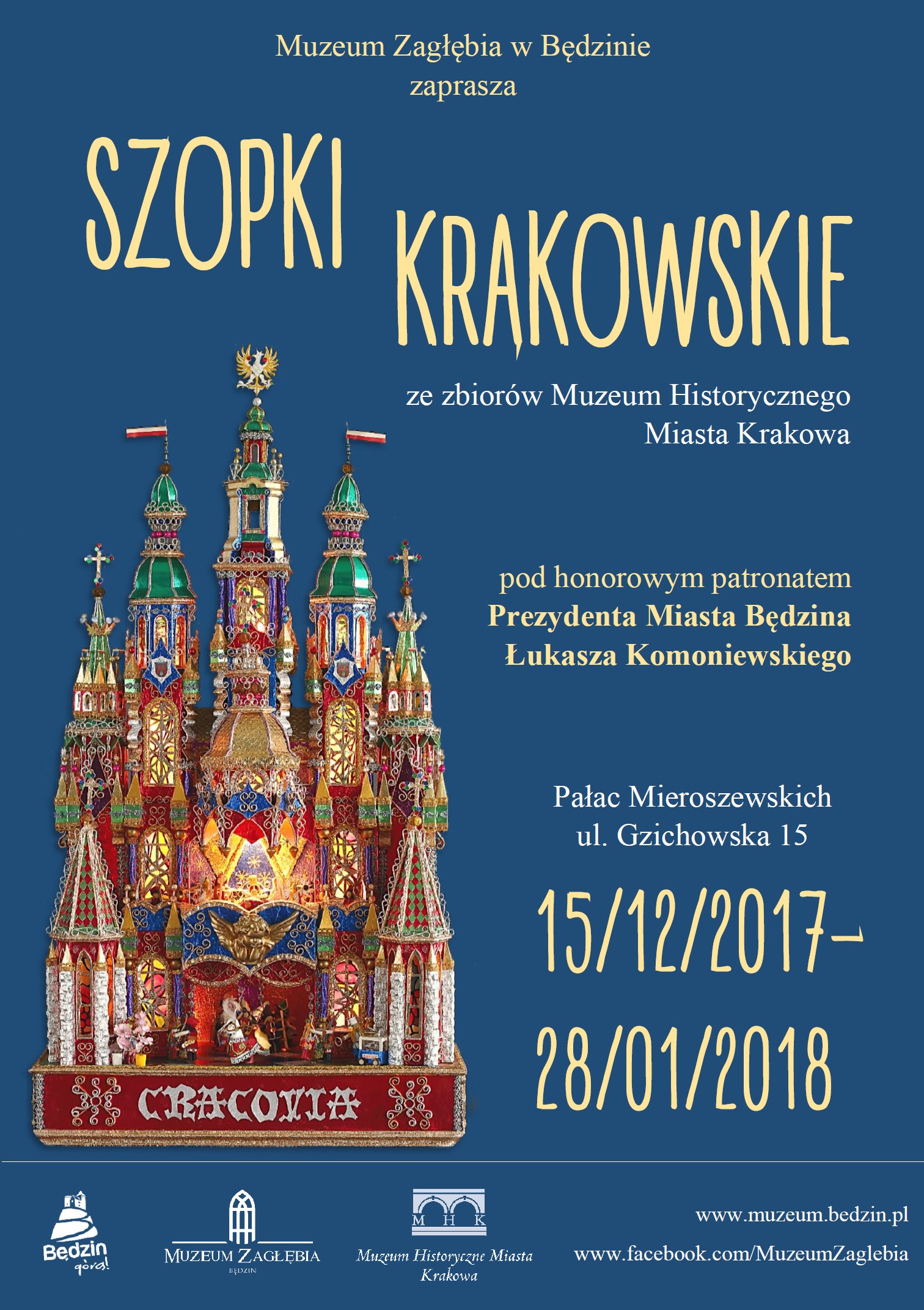 Muzeum Zagłębia już po raz 3 zaprasza na wystawę szopek krakowskich z kolekcji Muzeum Historycznego Miasta Krakowa. Ekspozycja prezentowana będzie w terminie 15/12/17 – 28/01/18 w Pałacu Mieroszewskich. Wystawę objął patronatem honorowym Prezydent Miasta Będzina Łukasz Komoniewski.