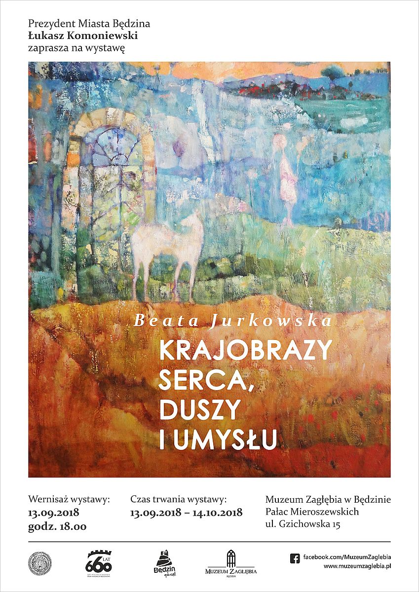 Prezydent Miasta Będzina Łukasz Komoniewski serdecznie zaprasza na wernisaż wystawy prac Beaty Jurkowskiej „Krajobrazy serca, duszy i umysłu”, który odbędzie się 13 września 2018 r. o godzinie 18.00  w Pałacu Mieroszewskich.