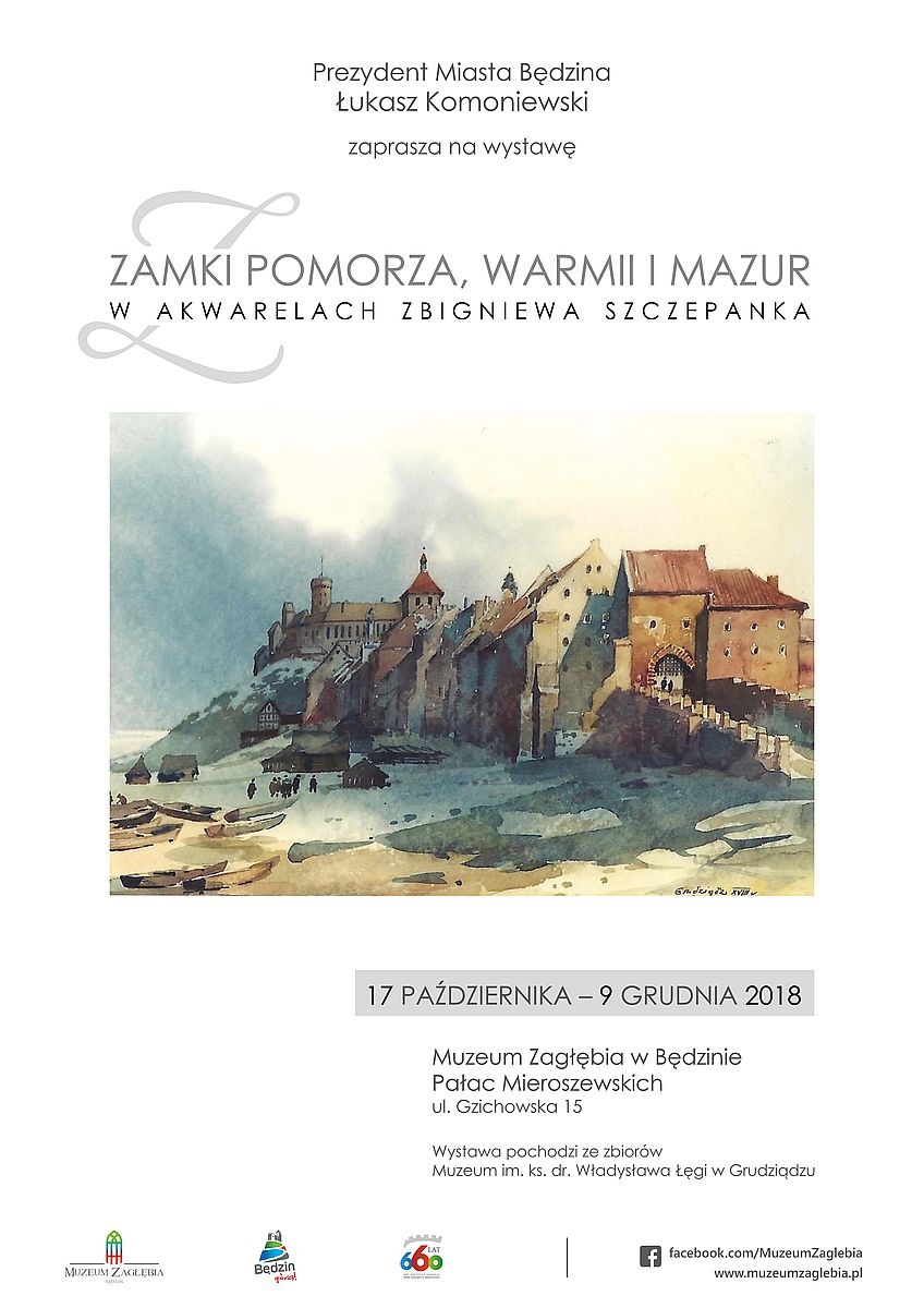 Prezydent Miasta Będzina Łukasz Komoniewski serdecznie zaprasza na wystawę „Zamki Pomorza, Warmii i Mazur w akwarelach Zbigniewa Szczepanka” ze zbiorów Muzeum im. ks. dr. Władysława Łęgi w Grudziądzu, która będzie prezentowana od 17 października do 9 grudnia b.r. w Pałacu Mieroszewskich.