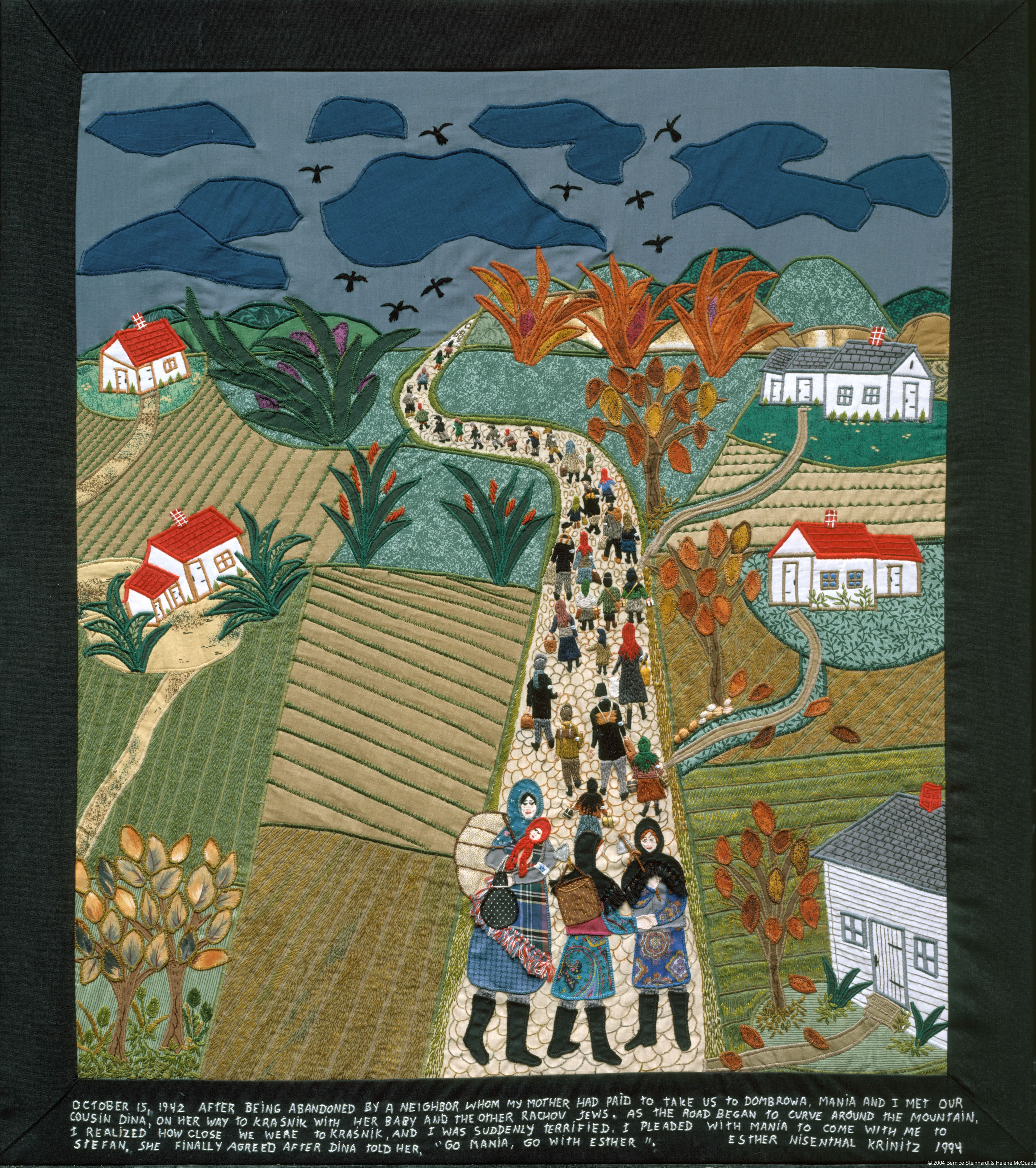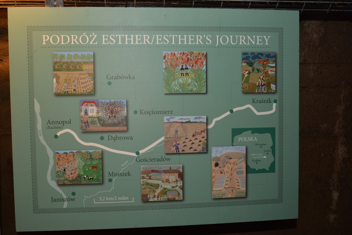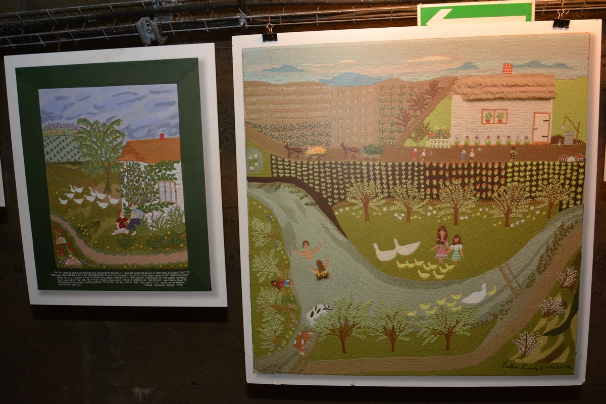 Ponad 30 lat po zakończeniu II wojny światowej kobieta postanowiła za pomocą własnych prac opowiedzieć bliskim o swoich wojennych losach. Esther była krawcową, ale nie posiadała wykształcenia artystycznego. Mimo to, przy użyciu różnych rodzajów materiału, igły i nici, stworzyła serię 36 kolaży, charakteryzujących się żywymi kolorami i dbałością o szczegóły oraz realizmem właściwym sztuce ludowej. Precyzyjnie wyszyte pod obrazami słowa składają się na poruszającą opowieść o przetrwaniu. Choć jej kolorowe obrazy na pierwszy rzut oka wydają się niemal radosne, ich bliższa analiza ujawnia uderzający kontrast pomiędzy sielskimi krajobrazami a przemocą, przerażeniem i zdradą, które je wypełniają.